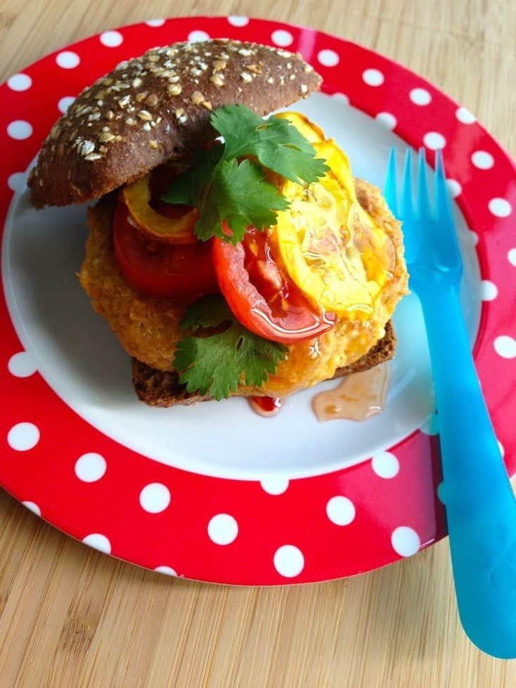 Voor ons volwassenen zijn de burgers ook te gek. Serveer ze dan met ringetjes rode ui, blaadjes verse koriander en een beetje chilisaus.