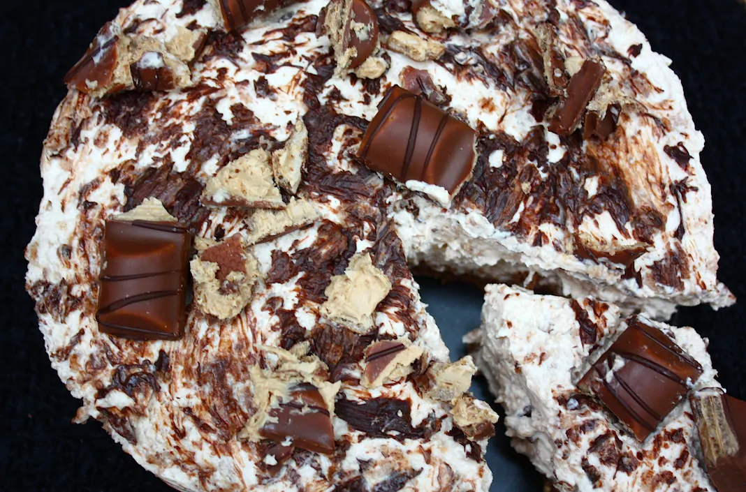 Vlak voor het serveren smelt je de chocola au bain-marie of in de magnetron (ik heb iets minder gedaan dan het officiële recept, aangezien de taart al redelijk wat chocola bevat) en breek je de Kinder Bueno voor de garnering in stukken. Garneer hiermee de taart en aanvallen maar!