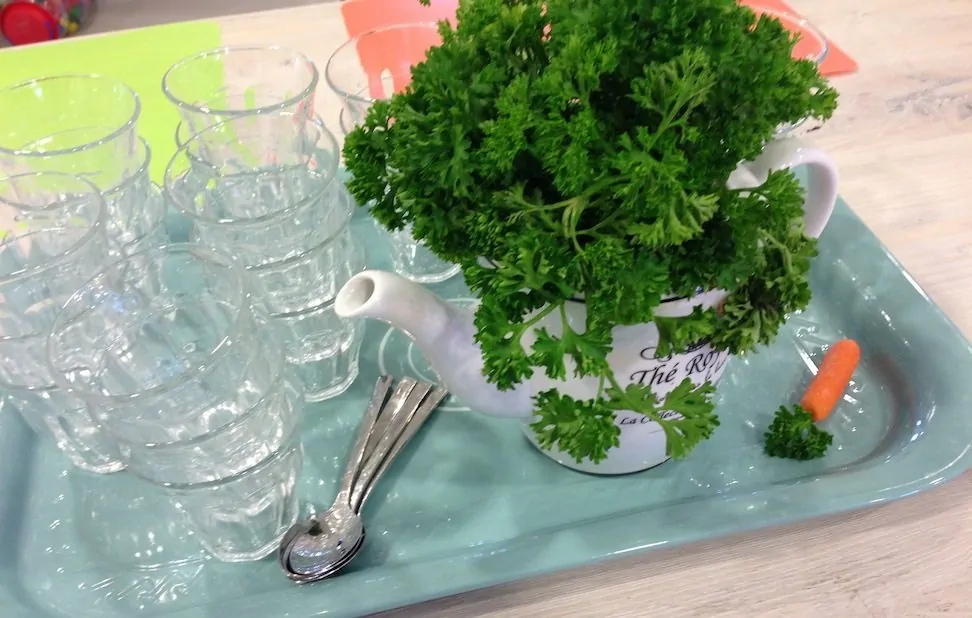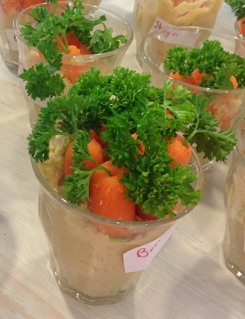 Maar wat moet er dan gebeuren met die worteltjes? Heel simpel. Het enige wat je nodig hebt zijn geschrapte worteltjes, wat kleine prikkertjes en takjes peterselie. Neem een worteltje, prik daar aan het uiteinde een diep gaatje in met een prikker en stop daar een takje peterselie in. Schep wat hummus in een glaasje of (klein aardewerk) potje en zet daar de worteltjes in met de peterselie. Et voila, daar zijn je worteltjes in de grond!
