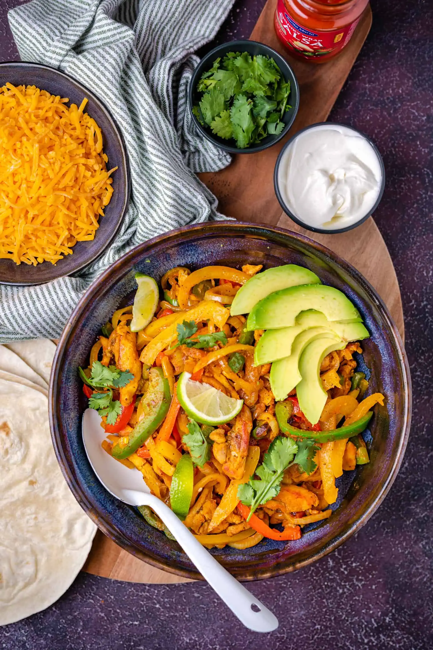 De vulling van deze fajita’s met kip kun je al eerder bereiden en je warmt het vlak voor het eten nog even snel op. Je serveert de vulling onder andere met tortilla’s, zure room, geraspte kaas, avocado en salsa. Aan tafel kan iedereen zijn of haar tortilla naar eigen wens vullen en als je de tortilla links en rechts over de vulling vouwt is je fajita al klaar.