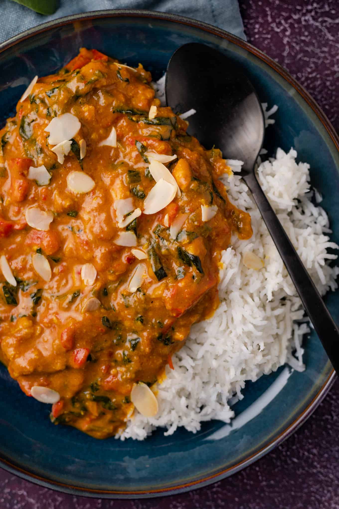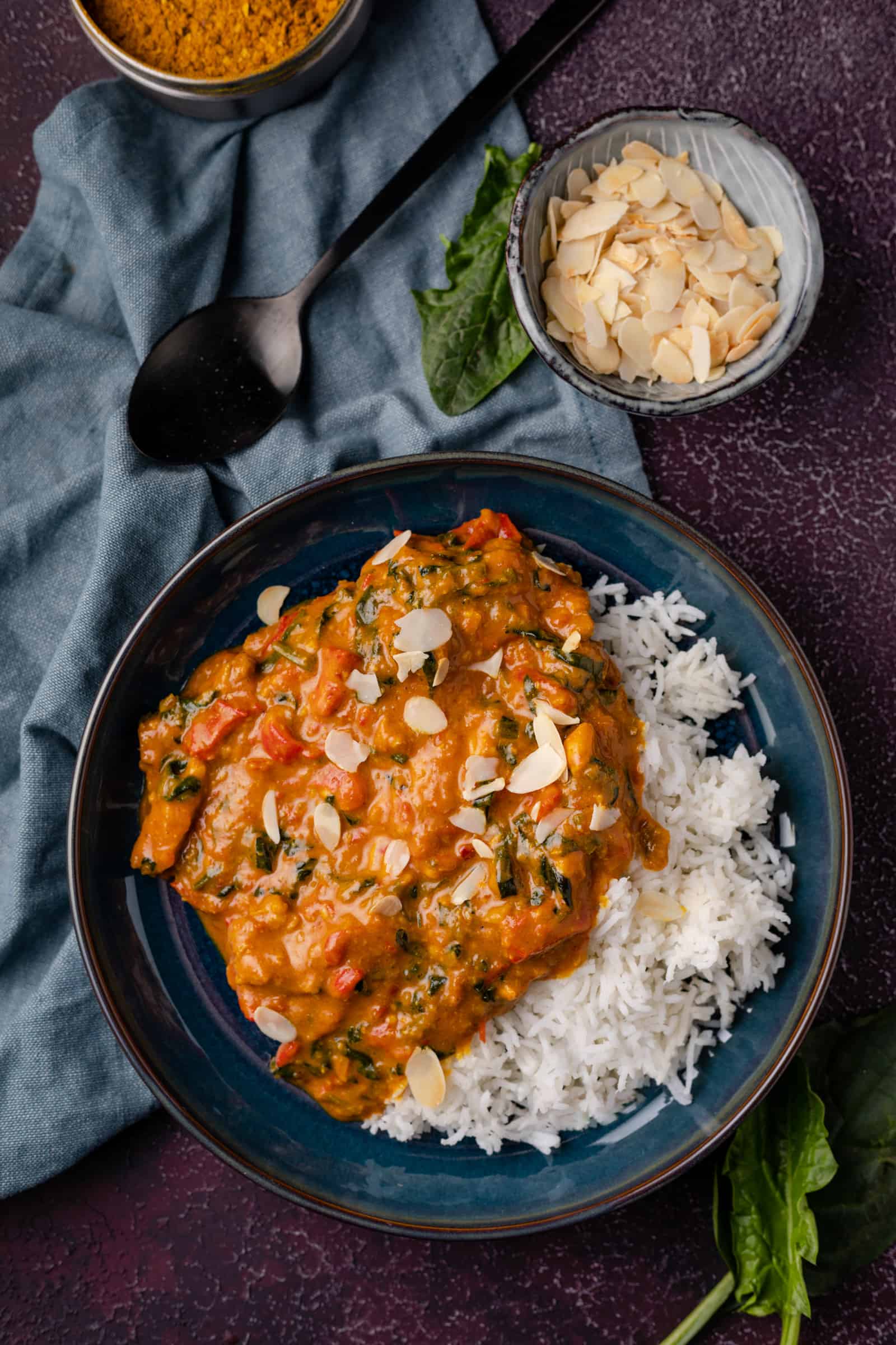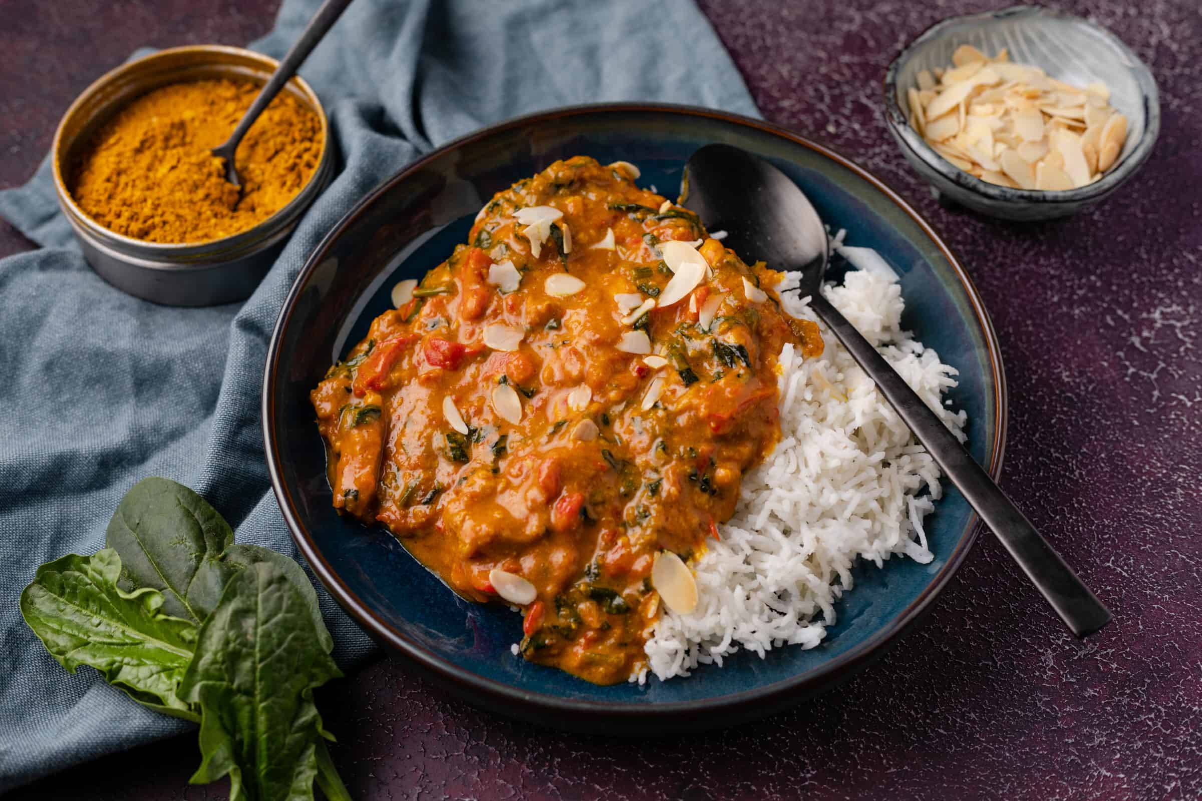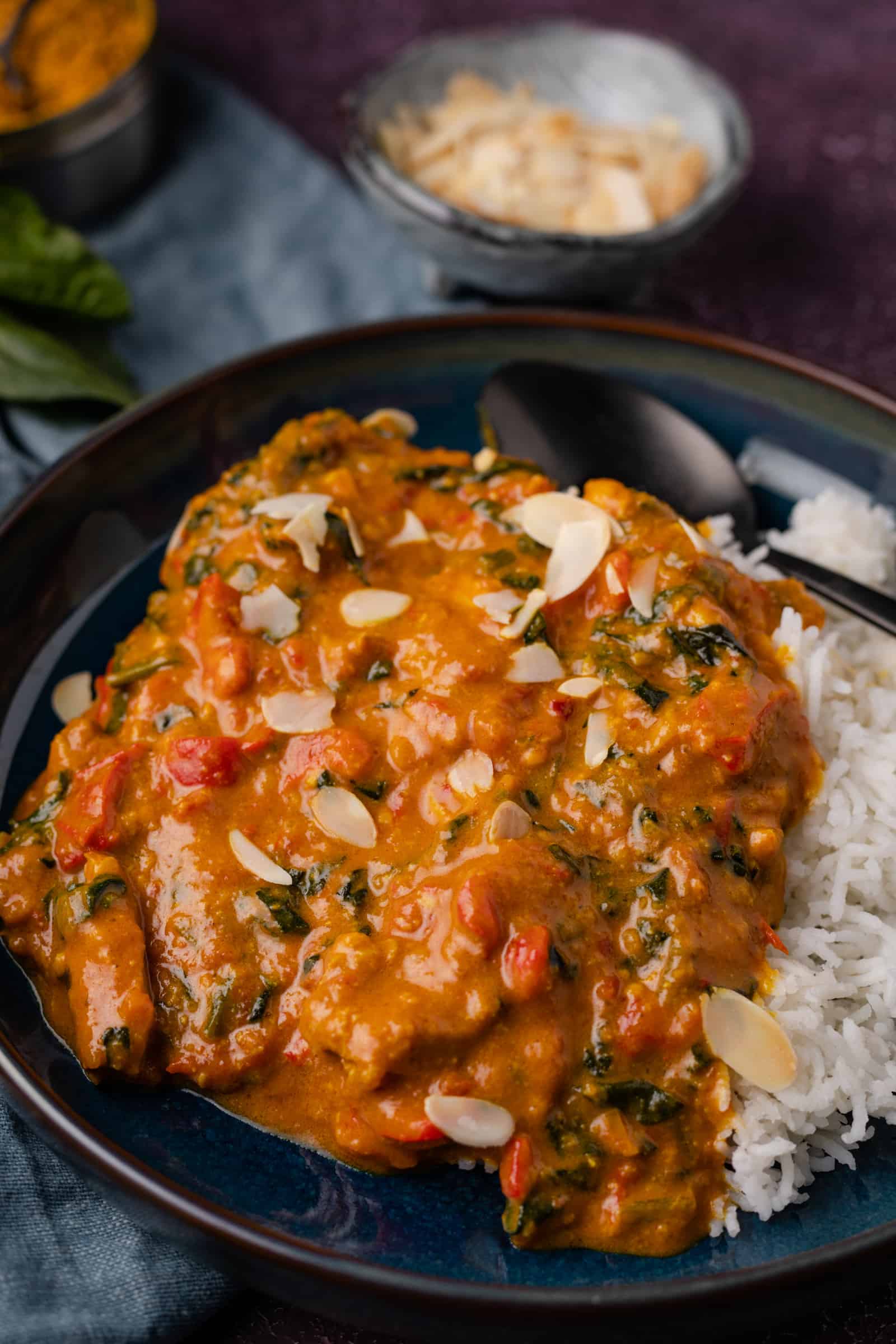 Vandaag reizen we voor deze curry af naar India waar ik de inspiratie hiervoor vond. Het is een mild gerecht met onder andere kerrie madras specerijen, kip, paprika, spinazie, tomaat, kokosmelk en amandelen geworden. Heerlijk romig en verre van pittig, waardoor ook kleine kindjes lekker kunnen mee eten. Je bepaalt zelf hoe intens je de smaak maakt door meer of minder specerijen te gebruiken: 2 eetlepels voor milder of 3 eetlepels voor intenser. Ik ging zelf, het zal je niet verrassen, voor de laatste optie.