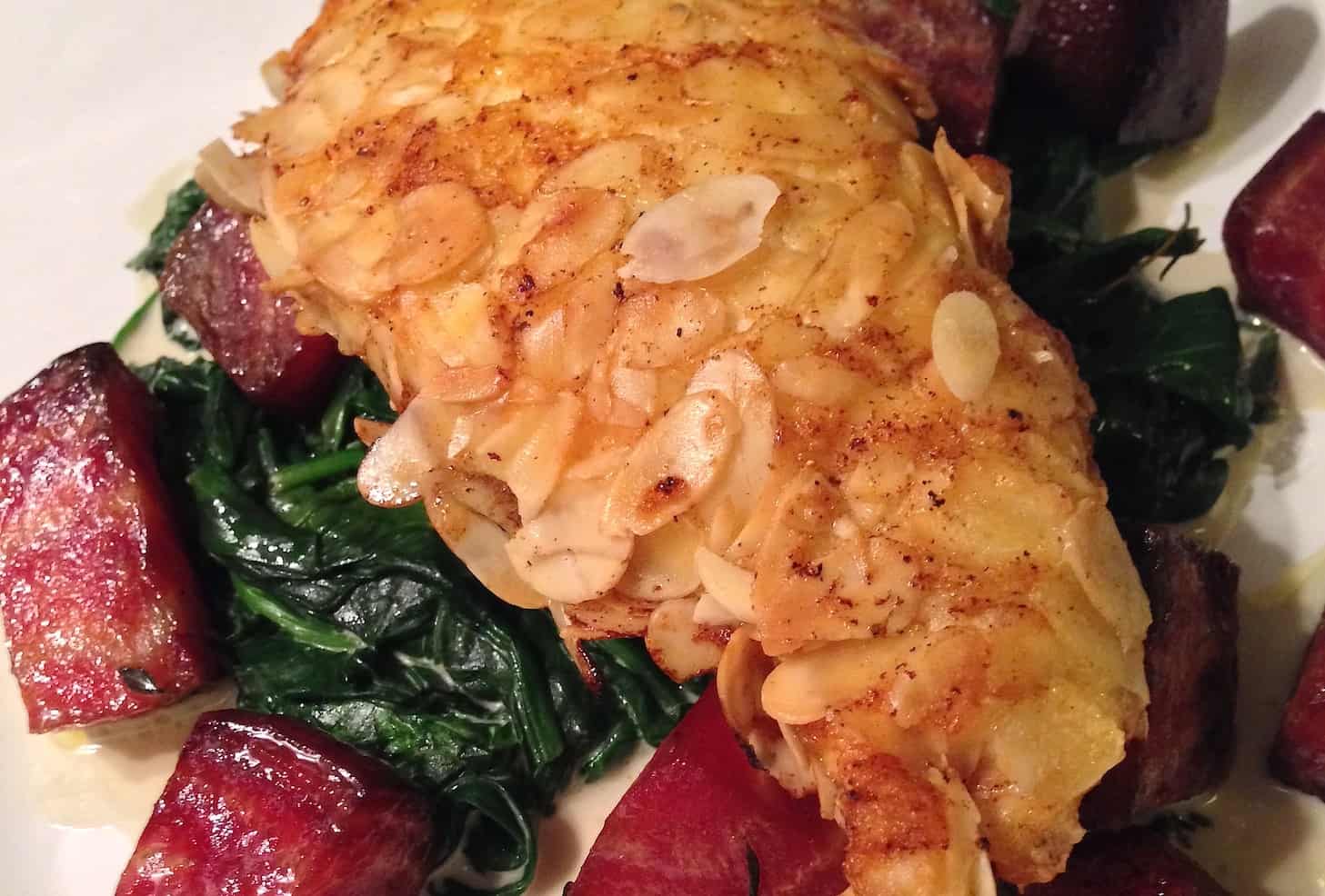 Serveer de kip met amandelkorst op een bedje van spinazie samen met de blokjes geroosterde biet.