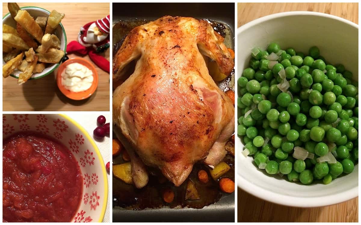 Serveer de geroosterde kip op een grote schaal. En zet daar bakjes met appel-cranberry compote, zoete aardappel patat, mayonaise en doperwten naast. Succes verzekerd 🙂