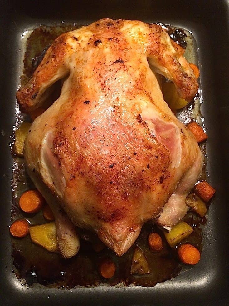 Hak wat wortelen, bleekselderij of andere groenten grof en leg deze onderin een bakblik. Leg hier de gevulde kip op en schuif het bakblik in de oven. Bak de kip 60-75 minuten in de oven totdat deze gaar is.