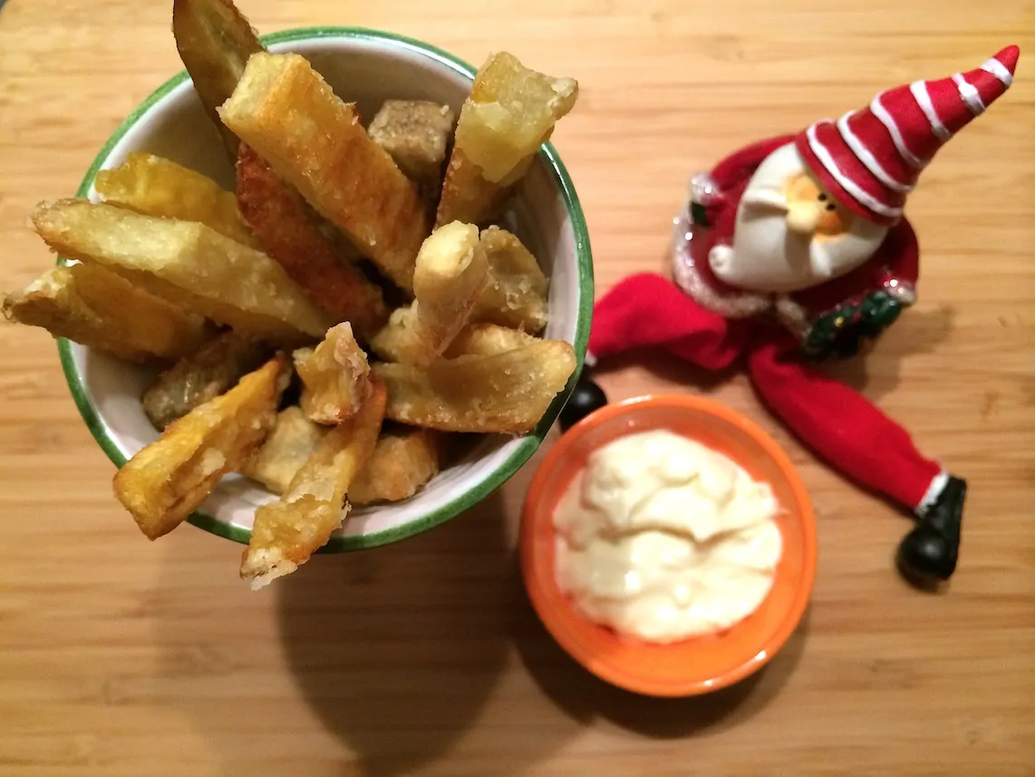 Ongeveer 2,5 uur voordat je het kerstdiner gaat serveren schil je de zoete aardappelen. Snijd ze in de vorm van frietjes en zet apart in een bak met koud water.