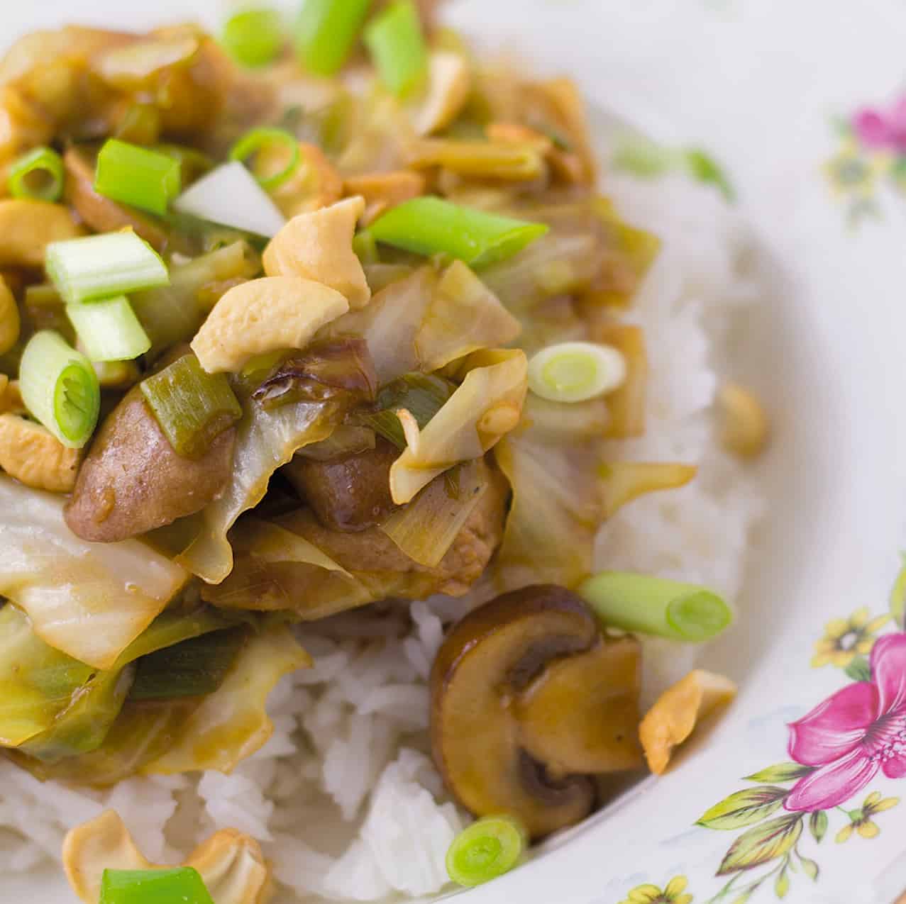 Snijd alle groenten: hak de knoflook fijn, de paddenstoelen door midden, de lente uitjes in ringen en de kool in repen. Snijd de kipfilet in stukjes.