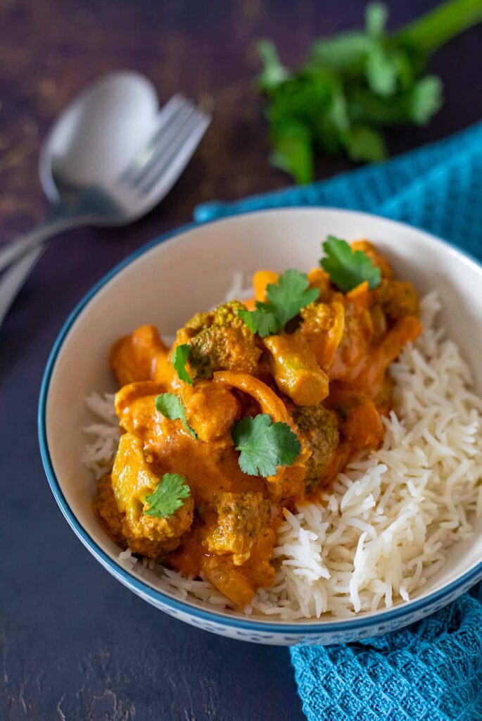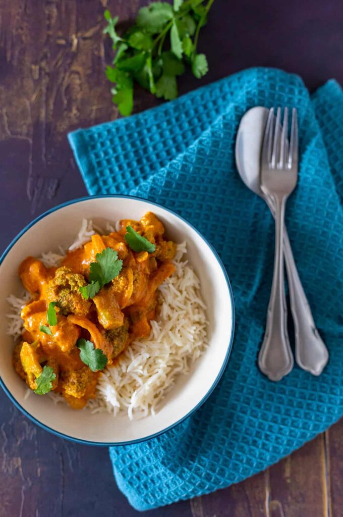 - Serveer de kip tikka masala met koriander en witte rijst.