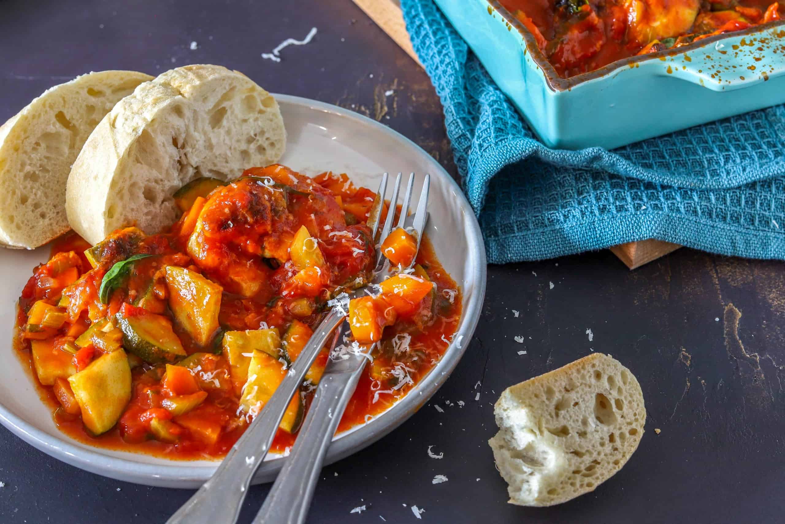 - Serveer de kipstoof rechtstreeks uit de oven, garneer de bovenkant met blaadjes basilicum. Serveer er brood of gekookte tagliatelle bij. Nog lekkerder wordt het als je de beetgaar gekookte tagliatelle even door wat warme knoflookolie husselt. Eet smakelijk!