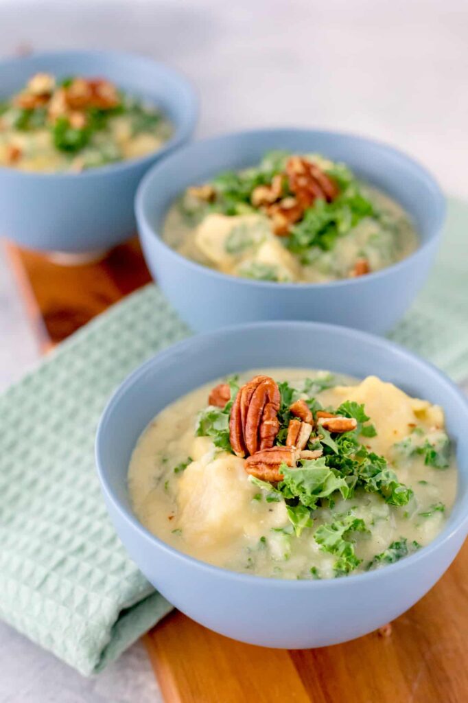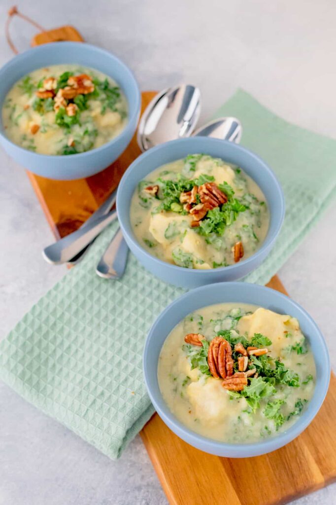 Vandaag heb ik een winterse maaltijdsoep voor jullie op het menu staan, namelijk knolselderijsoep! Ik maakte deze soep met typische ingrediënten voor dit seizoen zoals knolselderij en boerenkool. Het is een dikke soep die extra vullend wordt door de toevoeging van verse tortellini. Deze kun je vaak vinden in het koelschap van je supermarkt. Kies bijvoorbeeld de verse tortellini met kaas en noten, die hier goed bij past. Maar ook gedroogde tortellini kunnen prima. Geniet ervan!