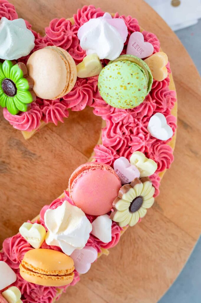 - Nu begint het leukste gedeelte: de decoratie! Leef je uit met allerlei snoepjes, macarons en zelfs bloemen voor het allermooiste koekhart voor je moeder!