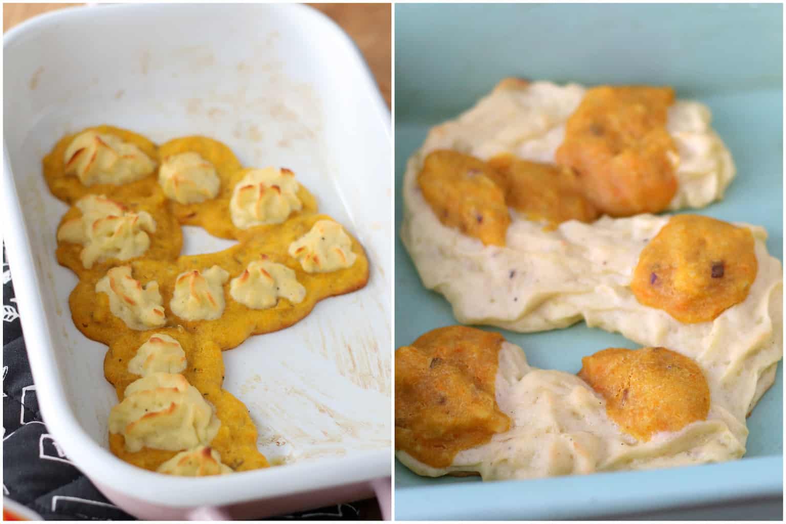 - Laat beide purees iets afkoelen en verwarm de oven voor op 200 graden. Zet beboterde ovenschaaltjes klaar of bekleed een bakblik met bakpapier.
