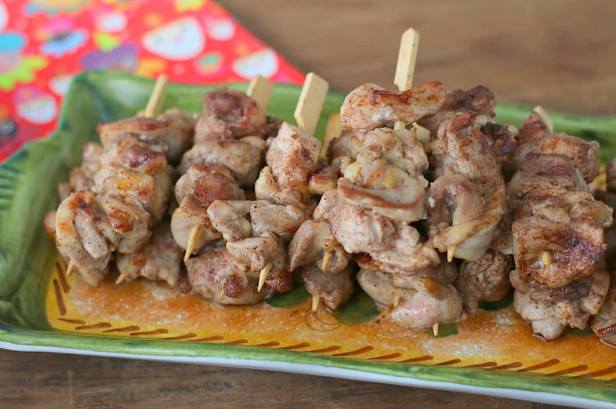 - Zet een grillpan op hoog vuur en bak ze rondom bruin aan. Zet daarna het vuur lager en laat nog langzaam doorgaren terwijl je de spiesjes af en toe omdraait.
