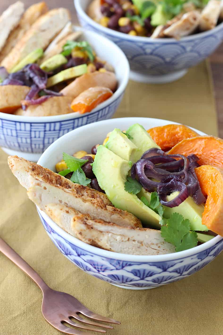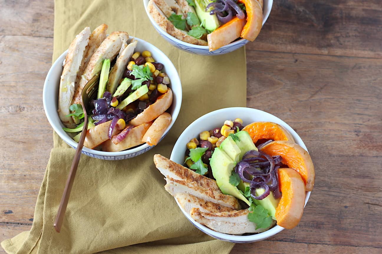 7. Haal de bakplaat uit de oven en snijd de kip in reepjes. Verdeel de rijst, pompoen, rode ui, mais, bonen en avocado over de kommetjes. Garneer voor de liefhebbers met wat verse koriander.