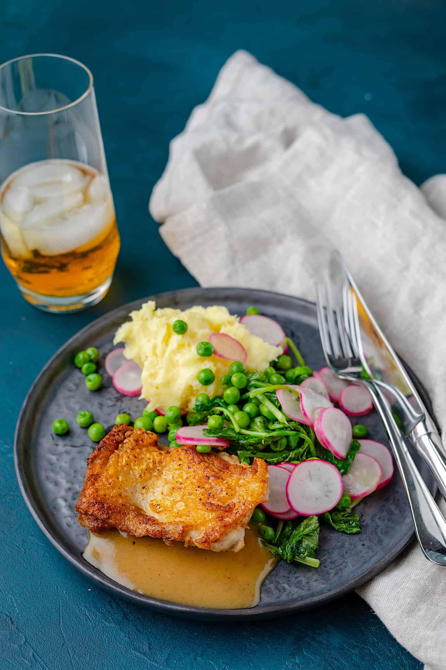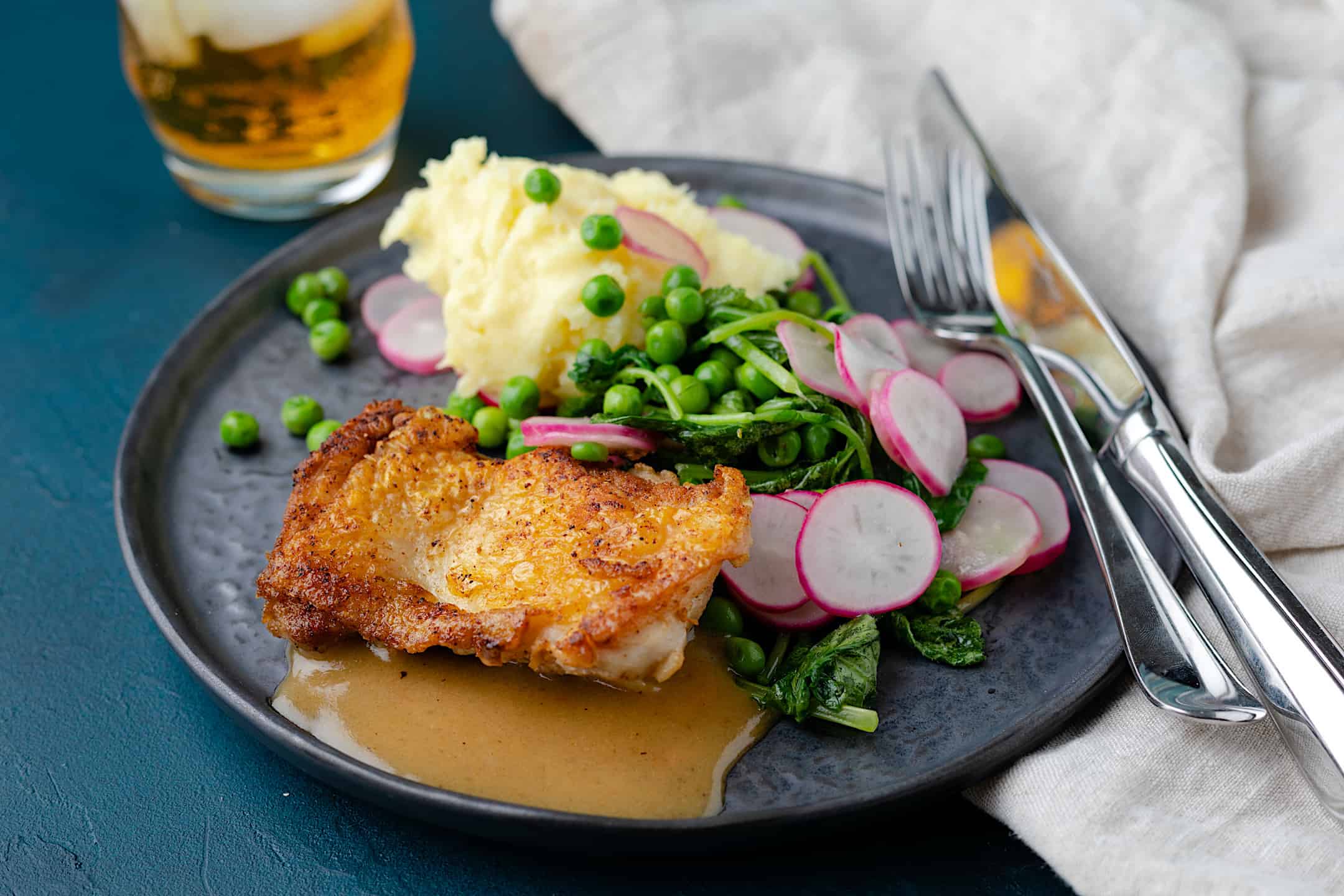 - Zet 4 mooie borden klaar, verwarm ze idealiter ook even voor in de oven, en schep op ieder bord een royale schep van de cidersaus. Leg hier een kippendij op, met het krokante velletje naar boven, en maak de borden verder op met de aardappelpuree en radijssalade. Serveer er eventueel een glas gekoelde Galipette Cidre naar keuze bij, met wat ijsblokjes.