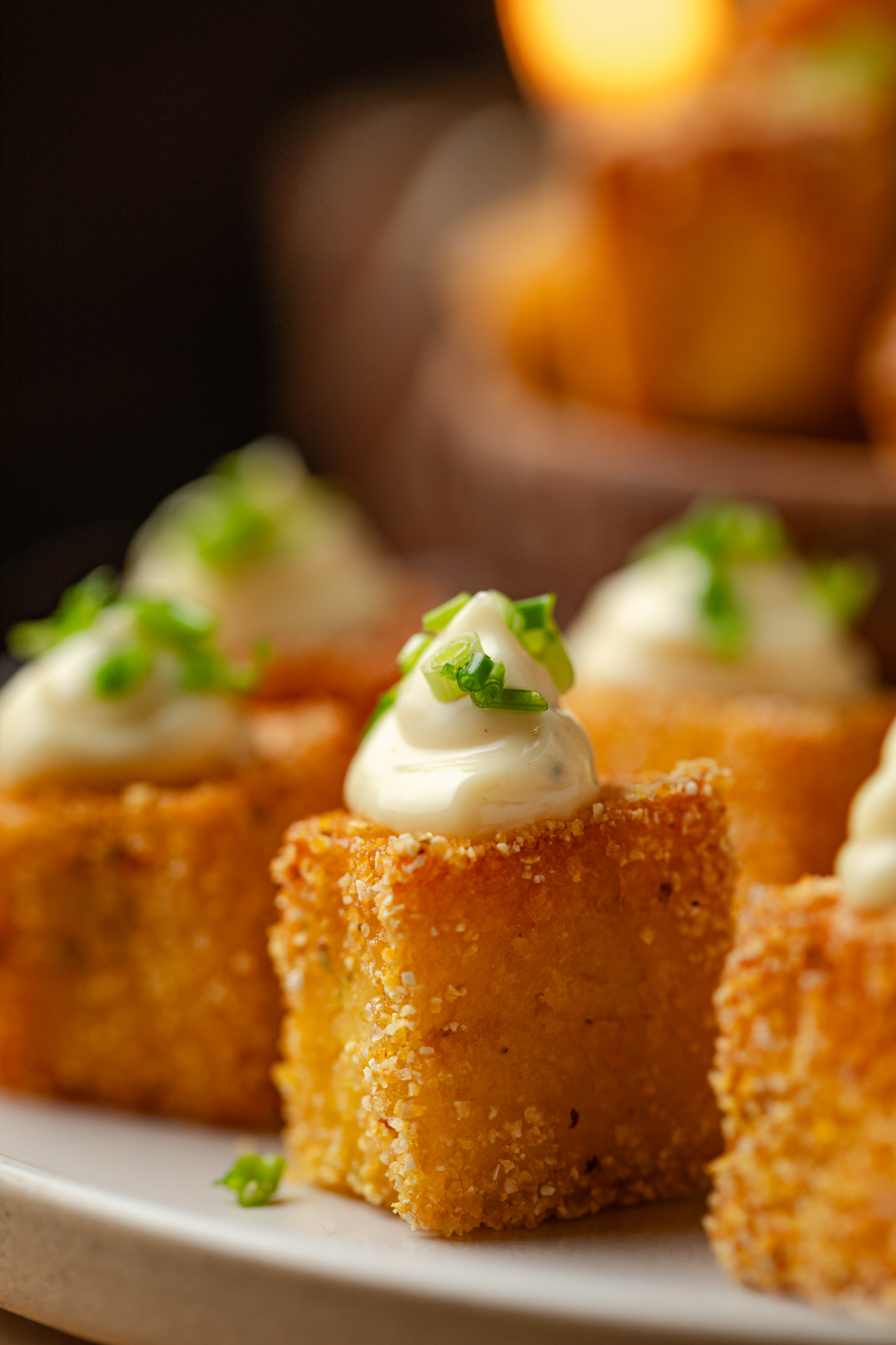 - Leg de krokante polenta bites op een mooie schaal en spuit bovenop een toefje truffelmayonaise. Garneer dit met fijngehakte bieslook en nog wat zwarte peper.