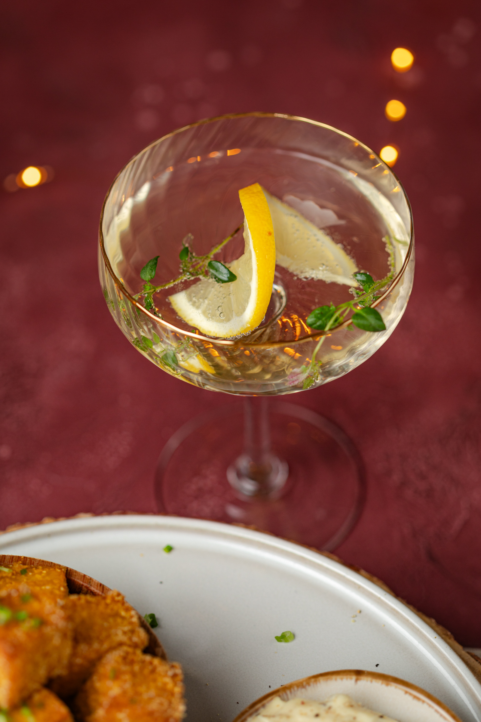 - Aperitief met alcohol: glas prosecco met een schijfje citroen en takje verse tijm