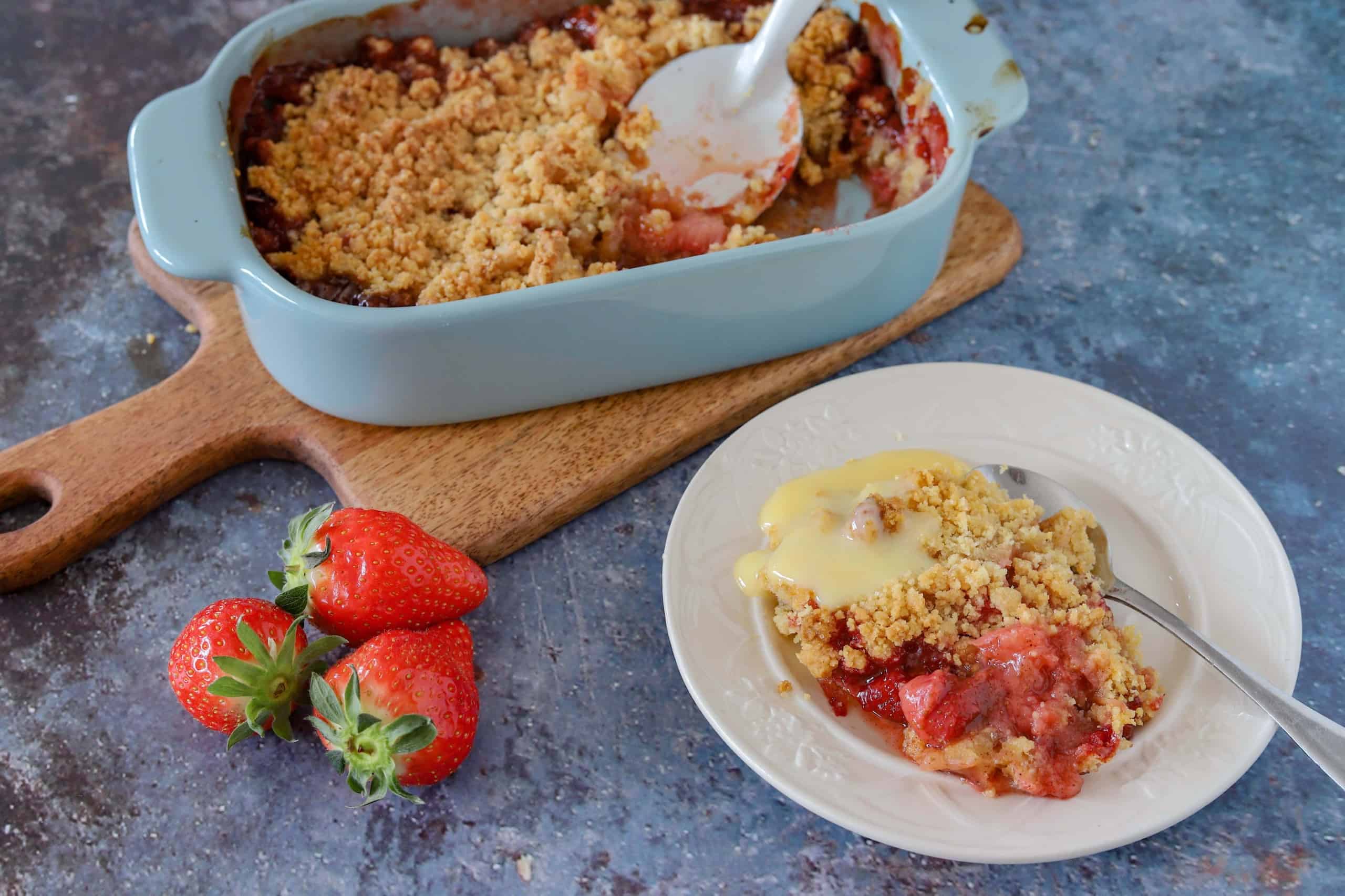 - Serveer de crumble met rabarber en aardbeien lauwwarm met de custard.
