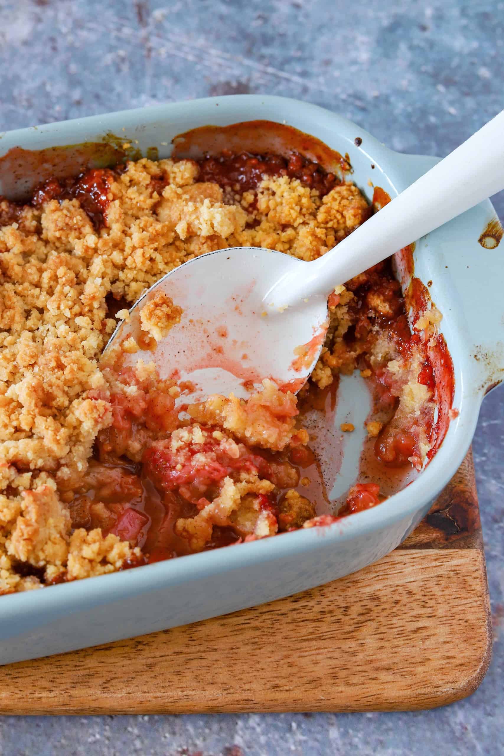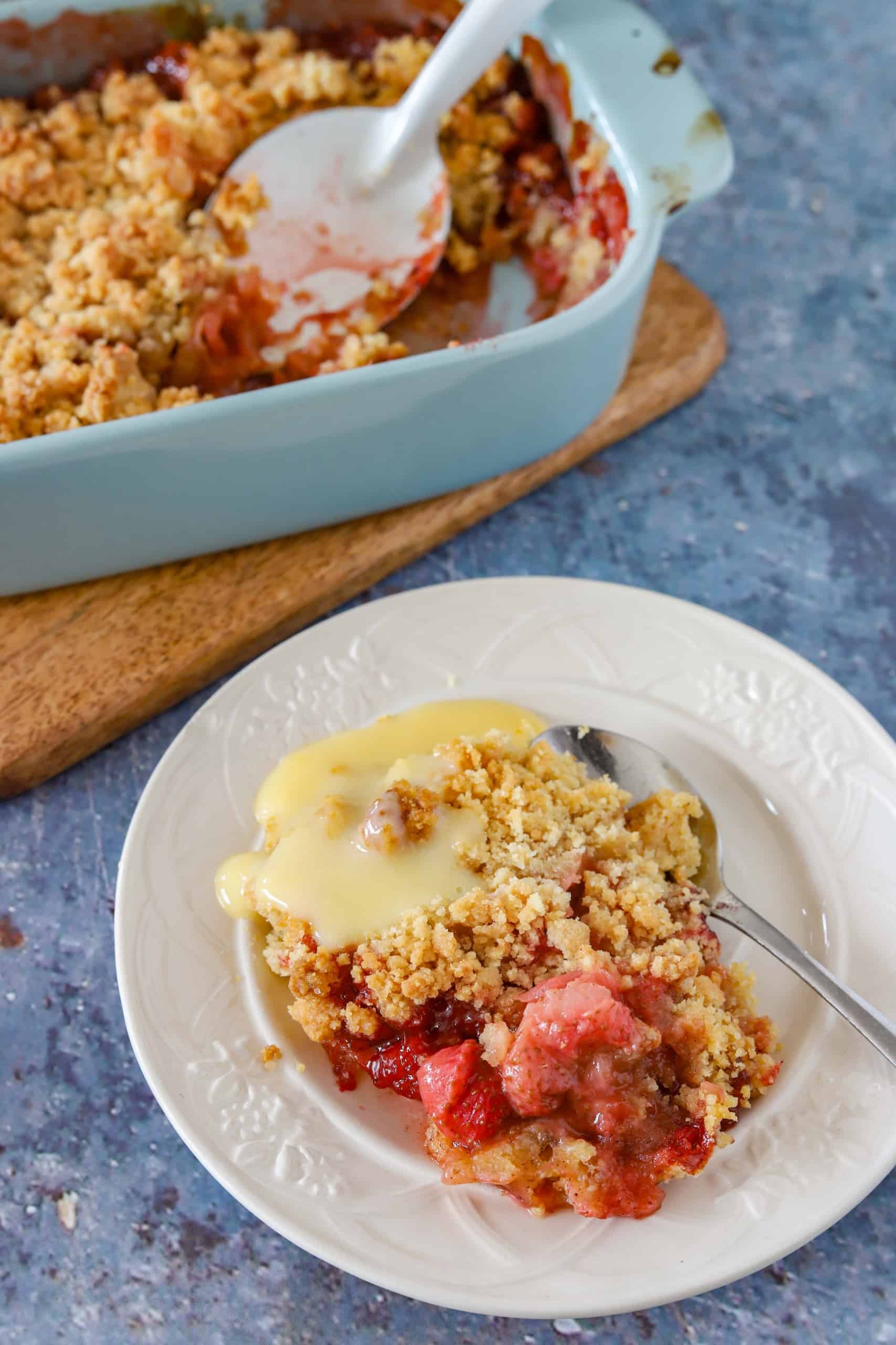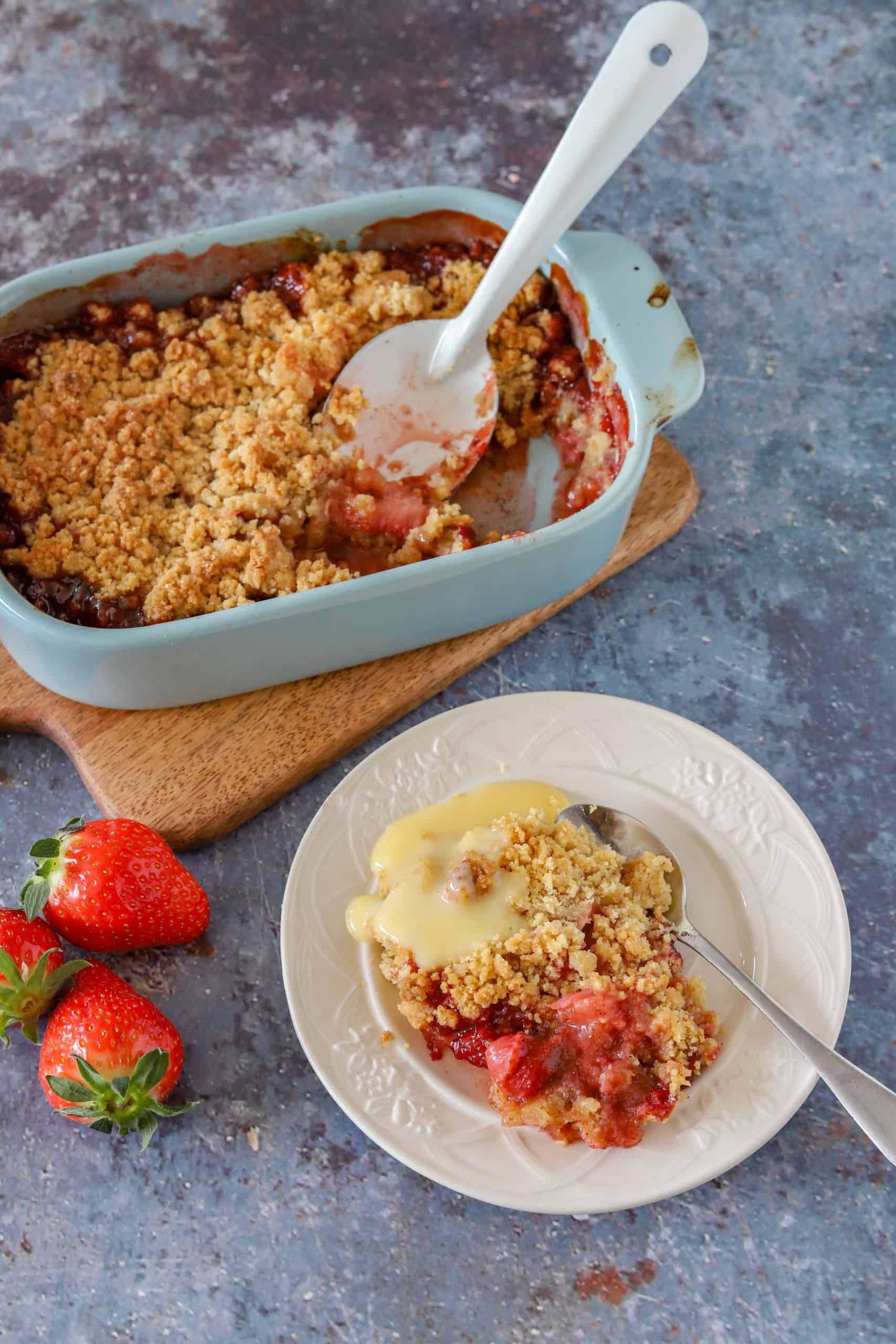 Ik hoor regelmatig dat mensen hun rabarber zoeten door de stengels alleen te combineren met zoete aardbeien. Heb ik geprobeerd, maar was niet mijn ding. Rabarber vind ik alleen echt lekker als het gezoet is met suiker, maar dat is mijn persoonlijke smaak. Als rabarber vervolgens ook gecombineerd wordt met specerijen ben je bij mij helemaal aan het goede adres. In deze crumble met rabarber en aardbeien was de smaak perfect in balans. De kruidige en zoete fruitlaag, gecombineerd met een dikke, krokante kruimeltopping en dan ook nog een bakje zelfgemaakte custard erbij. Een perfect lentedessert, geniet ervan!