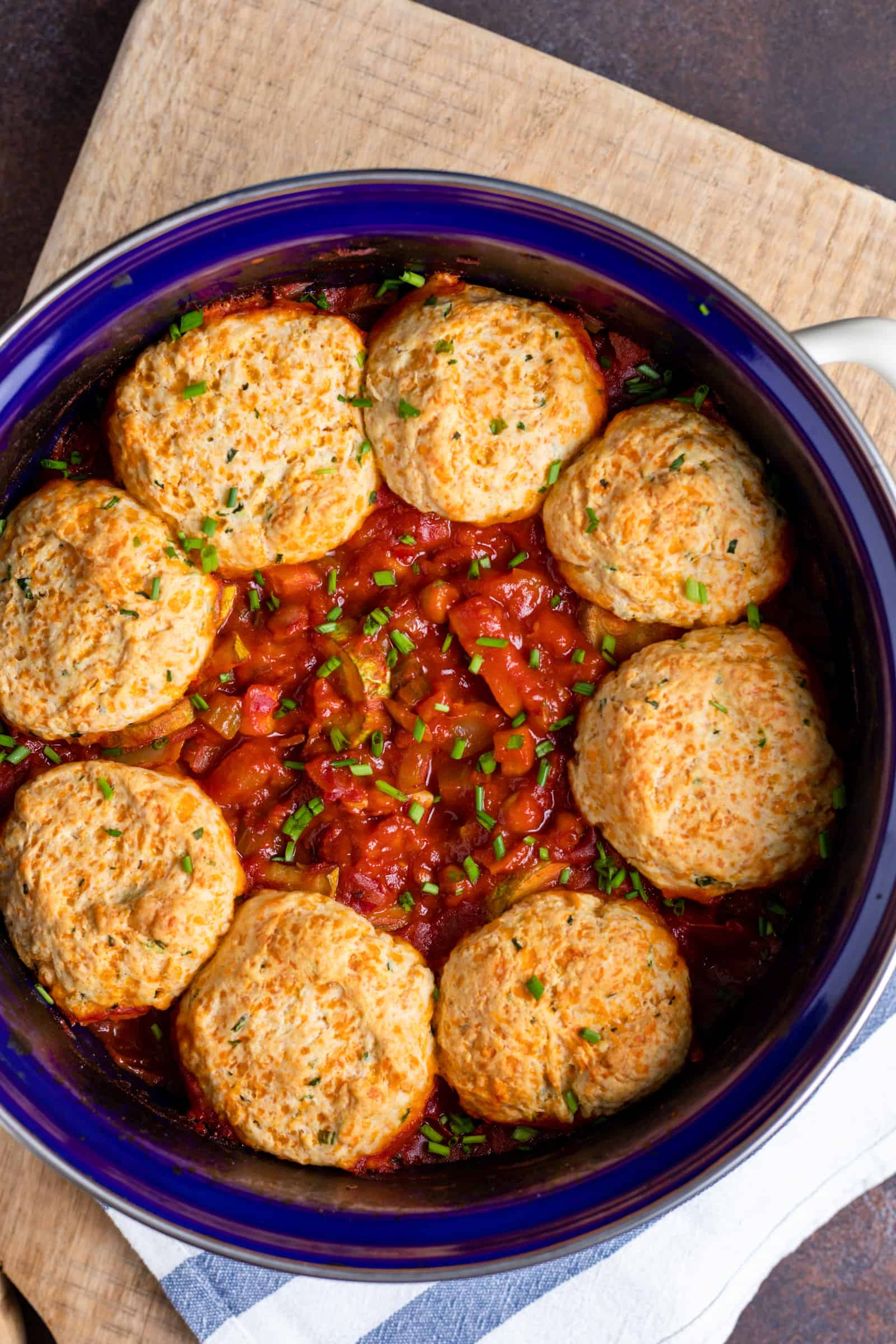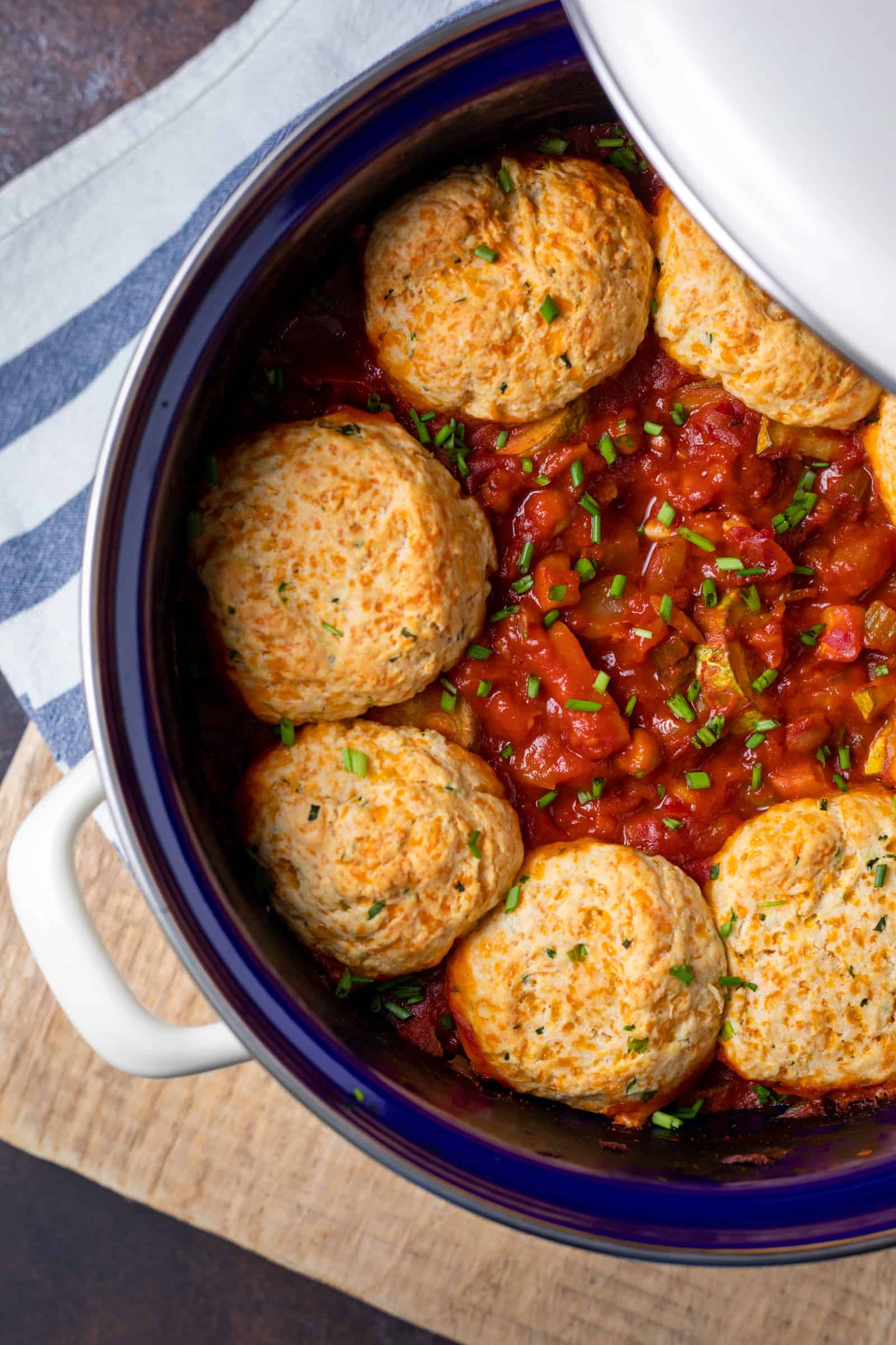 Het leuke aan dit recept is dat je het hele gerecht in één pan kunt maken. Ik gebruikte er zelf mijn geëmailleerde BK Indigo braadpan van 26 cm voor. Ik liet de braadpan eerst op het vuur staan zodat de groenten konden stoven en daarna schoof ik ‘m zo de oven in om de kaasbroodjes te bakken. Ja, die garen dus in de saus, hoe geniaal is dat!