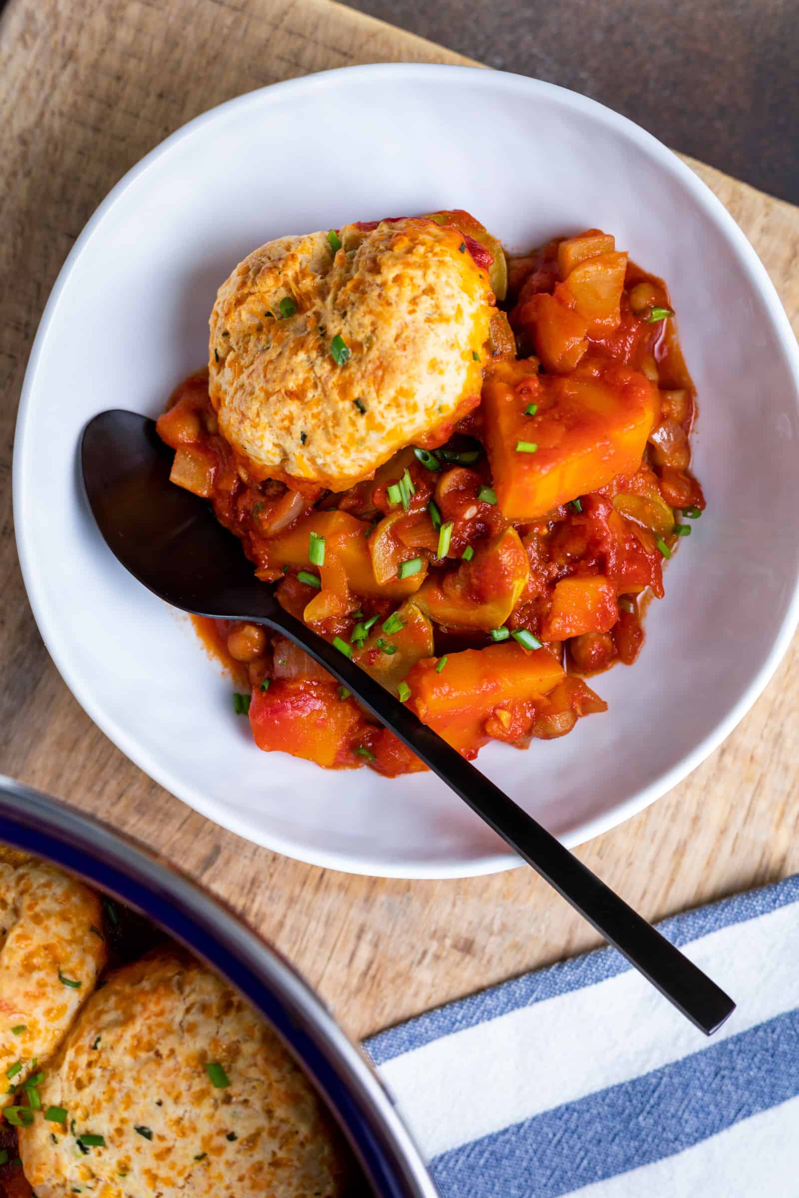 De laatste maanden kook ik steeds vaker met ingrediënten die ik al in huis heb. Ik ga ermee aan de slag en zie wel waar ik eindig, en meestal komt dat helemaal goed ;-). Soms haal ik ook mijn inspiratie uit online recepten, als ik het even niet weet. Zo wilde ik deze keer iets maken met allemaal verschillende groenten in een kruidige groentestoof, had ik nog een kliekje rozenharissa over (1 eetlepel om precies te zijn) en ik wilde heel graag eens zelfs snelle kaasbroodjes, die ze internationaal ook wel ‘cheese dumplings’ noemen, maken. Ik vond de inspiratie, maakte er mijn eigen versie van en de groentestoof was werkelijk zalig!