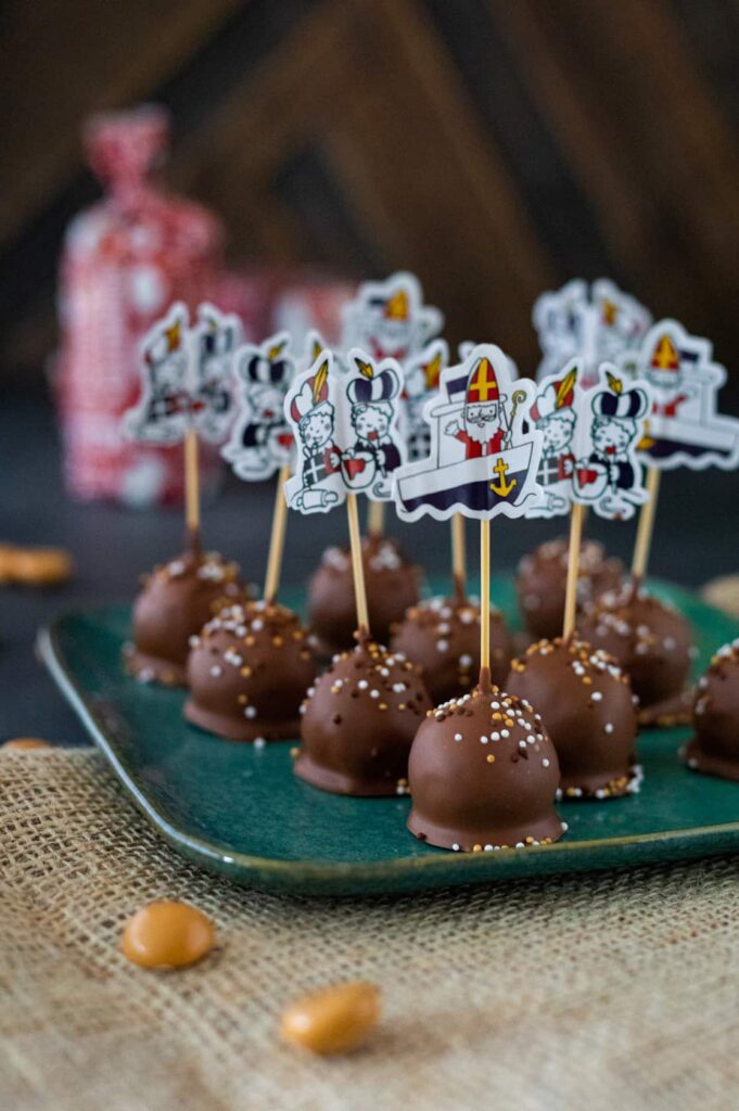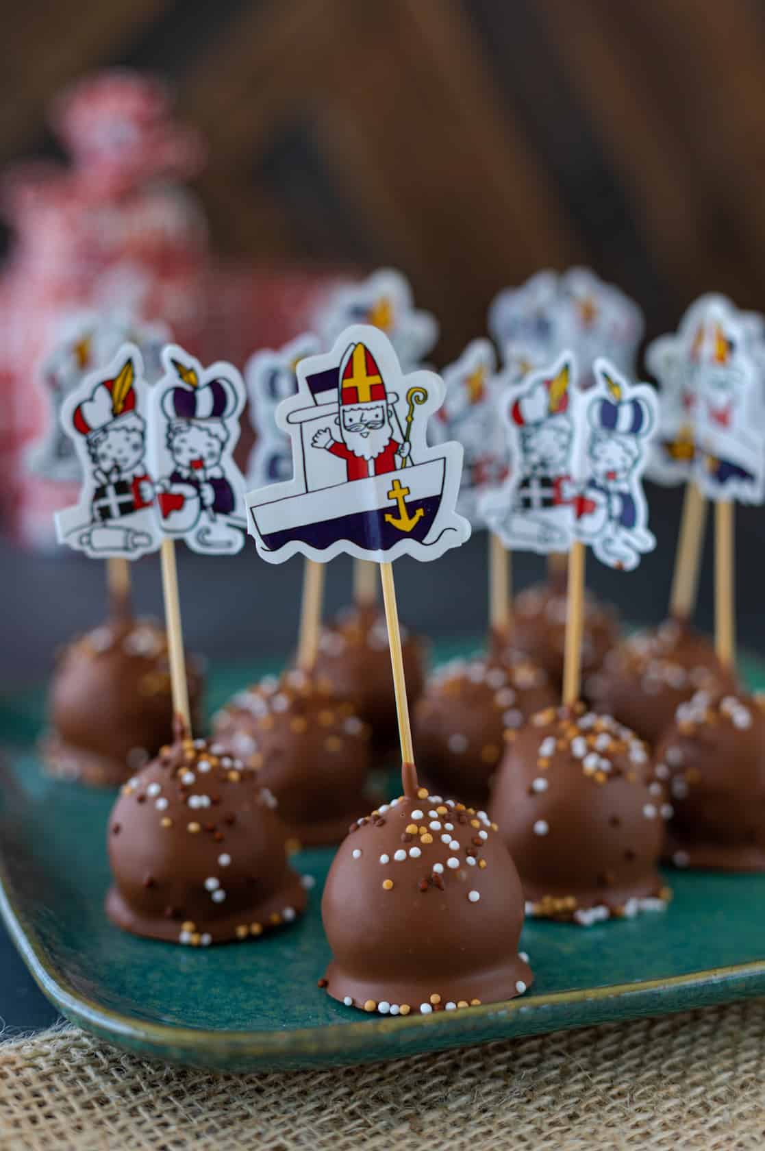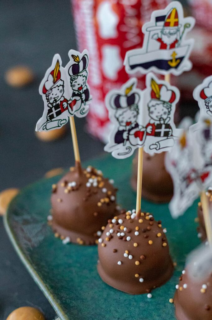 - Steek in de tussentijd vast in iedere truffel een gezellig stokje en zet een bakje met de chocoladesprinkles klaar. Dip vervolgens iedere truffel volledig in de chocolade, haal weer omhoog en laat iets uitlekken. Zet de truffel weer op het bakpapier en garneer direct met de sprinkles. Dit moet je doen als de chocolade nog gesmolten is zodat ze vast gaan zitten. Anders heeft het geen zin meer ;-). Herhaal dit met alle truffels. Bij de laatste 2 truffels is je chocolade bijna op, maar die kun je er dan overheen schenken in plaats van dippen, zo maak je alles op.