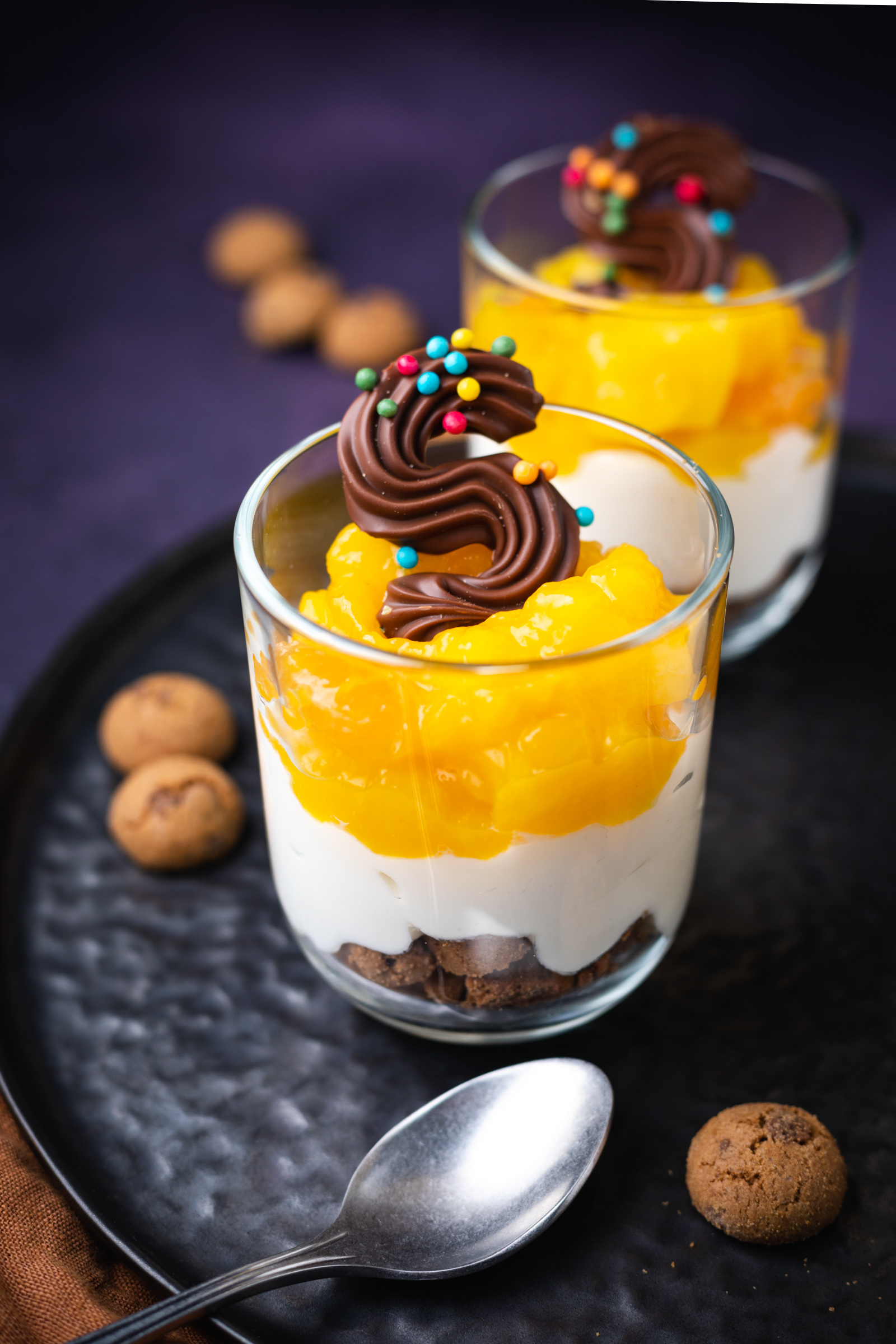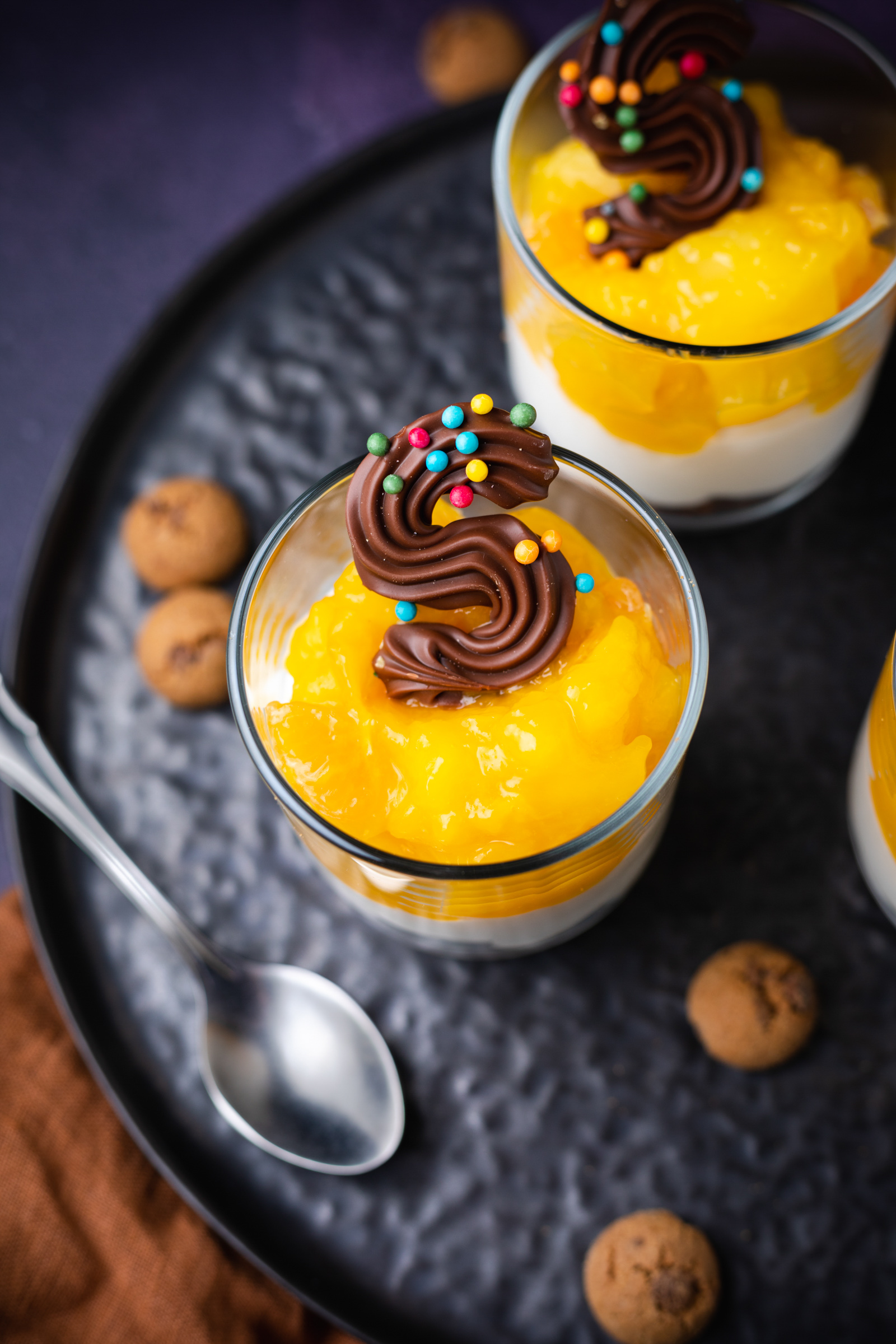 - Als laatste gaat er een royale lepel van de mango-mandarijntopping over. Garneer met een leuk sinterklaaschocolaatje en serveer.
