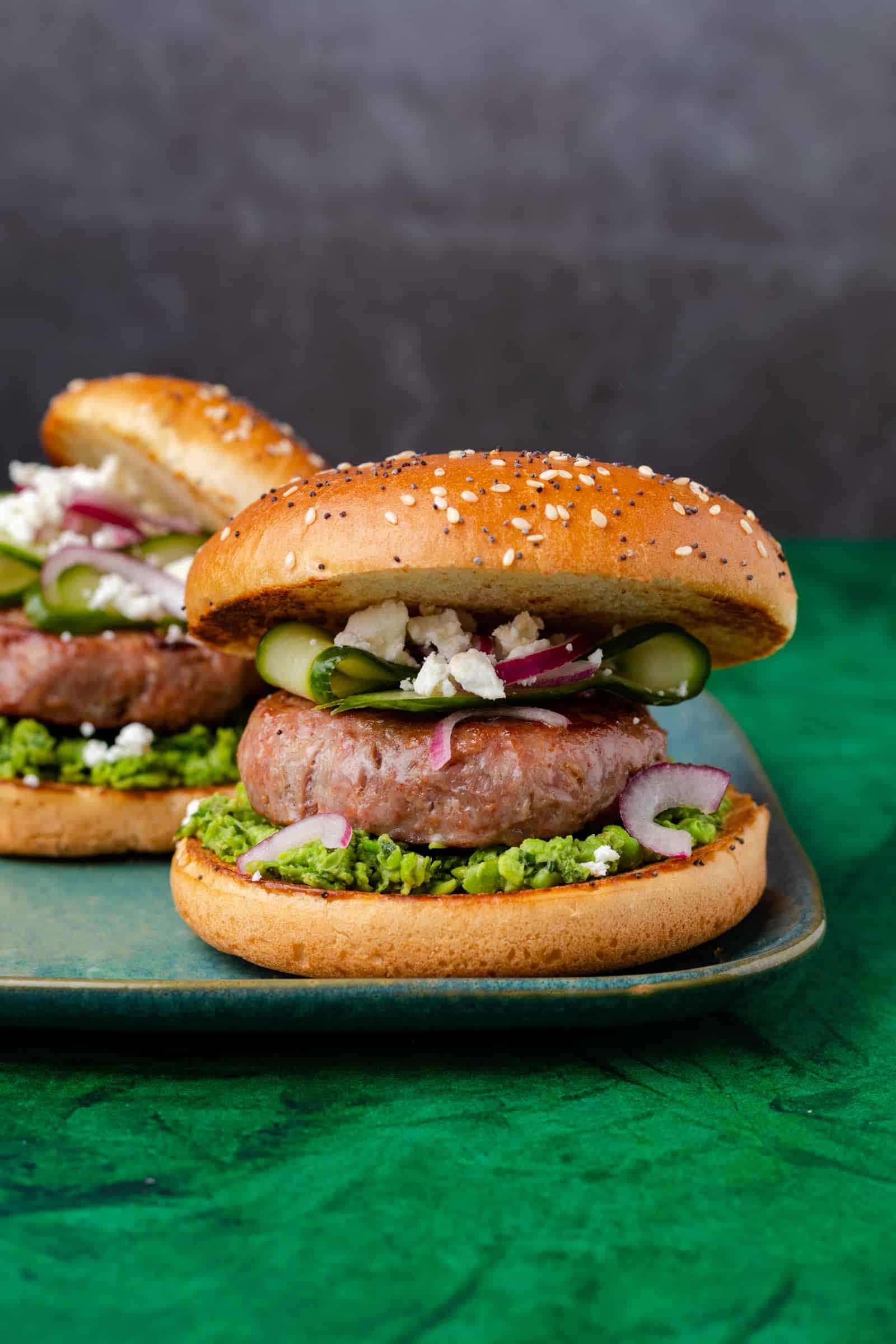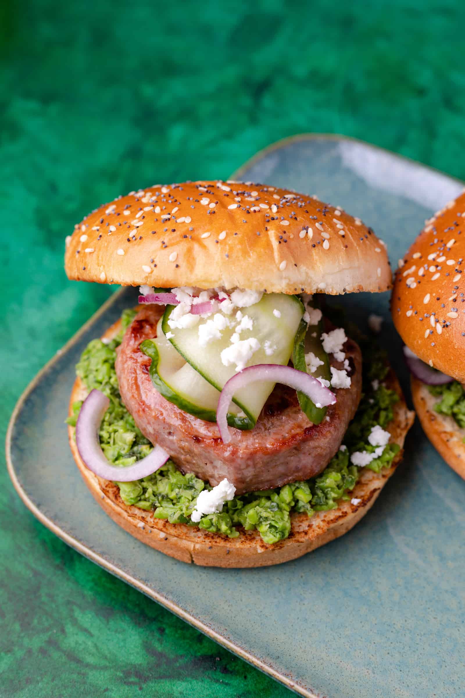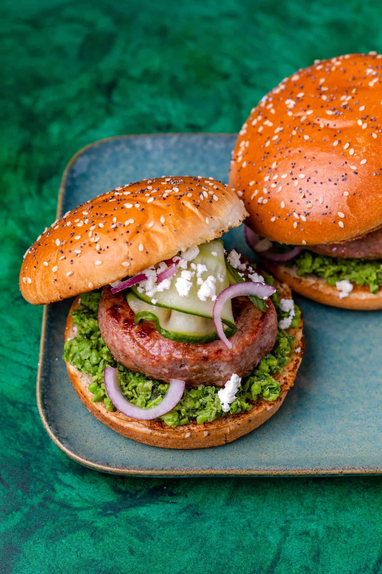 - Beleg ieder broodje met een royale schep van de doperwtenspread en leg hier een lamsburger op. Garneer naar eigen inzicht met het zoetzuur en de verkruimelde feta. Eindig met de bovenkant van het broodje en serveer direct.