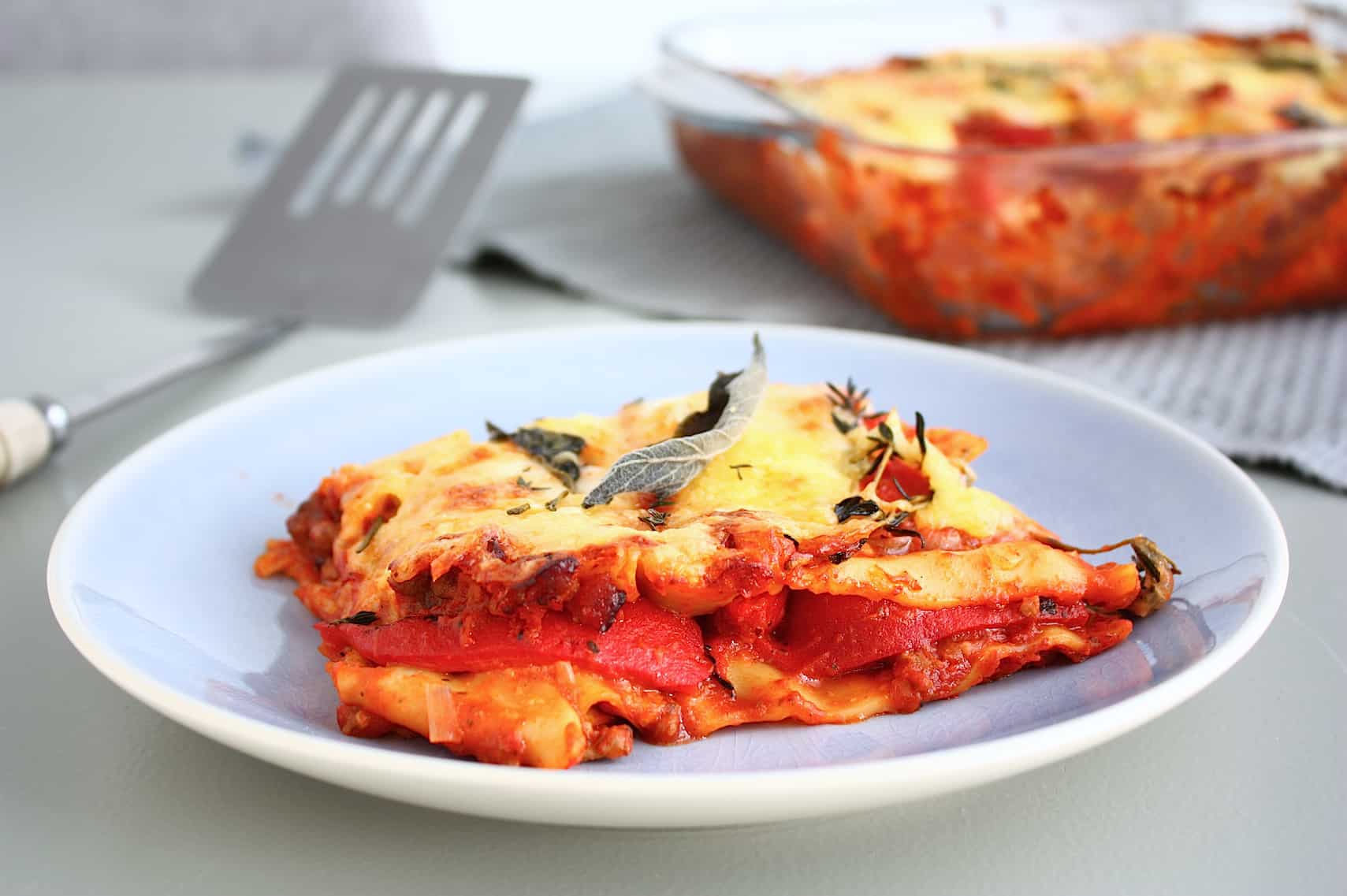 Toen ik ongeveer twee jaar geleden begon te daten met mijn vriend nodigde hij me uit om voor het eerst bij hem thuis te komen eten. Dat leek me wel wat, want ook toen was ik al dol op eten. Geheel zonder verwachting schoof ik aan tafel en je raadt het misschien al, deze lasagne met geroosterde paprika en kruiden is wat hij voor me maakte.