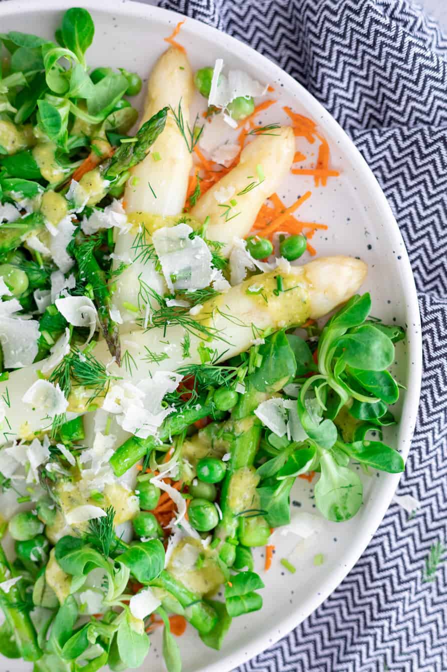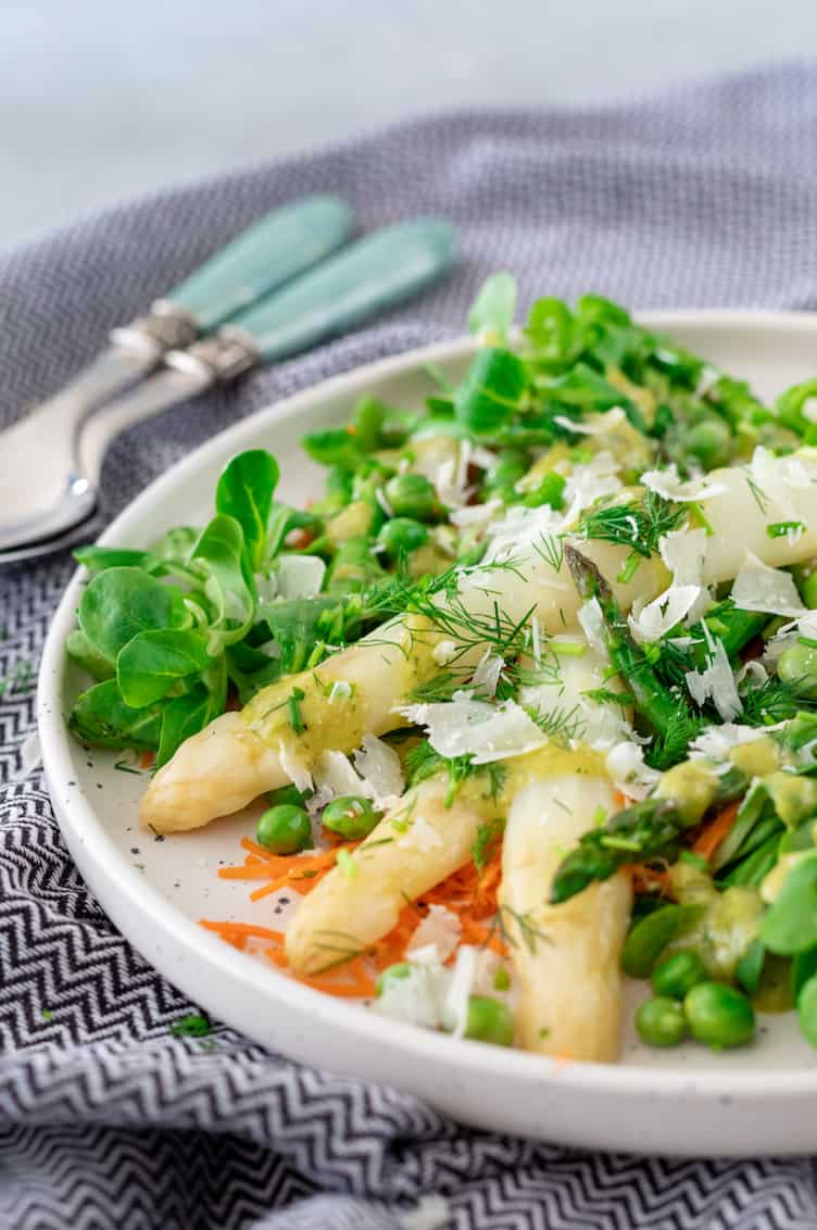 Ik maakte een heerlijke lente salade met asperges, doperwten, frisse dressing, kruiden en Parmezaanse. In dit seizoen kan ik niet genoeg krijgen van asperges, zowel wit als groen. Daarom combineerde ik ze met al het andere lekkers voor een feestje op je bord!