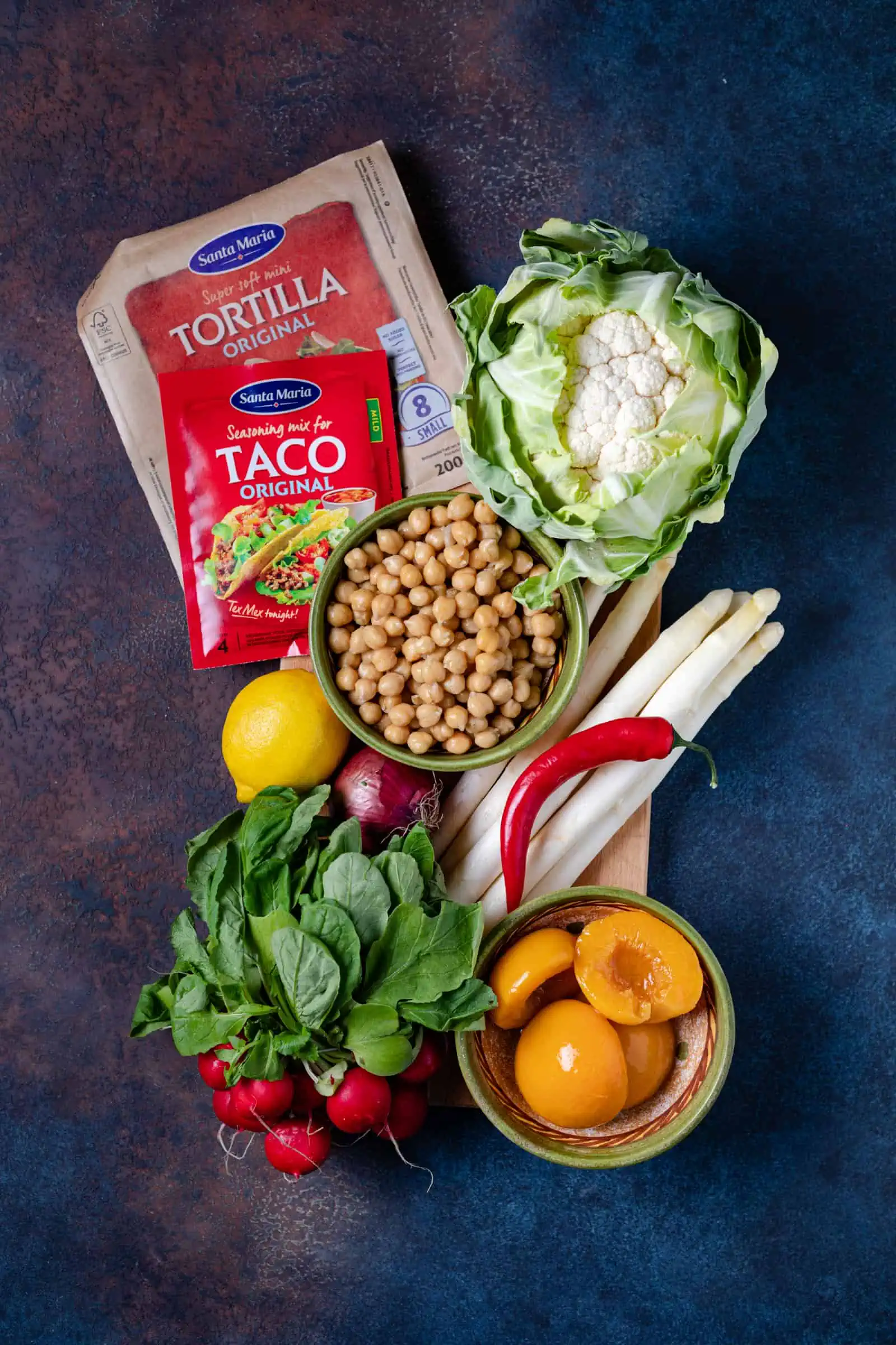 Daarmee dook ik de keuken in de volgende dag en dat resulteerde in deze zalige lente taco’s met bloemkool, asperges, zoetzure radijsjes en kikkererwten, die naast bijzonder lekker en fris ook volledig plantaardig zijn. Dat kom je niet vaak tegen in de Tex Mex keuken en vond ik daarom ook weleens verfrissend. Kom, we gaan taco’s maken samen!