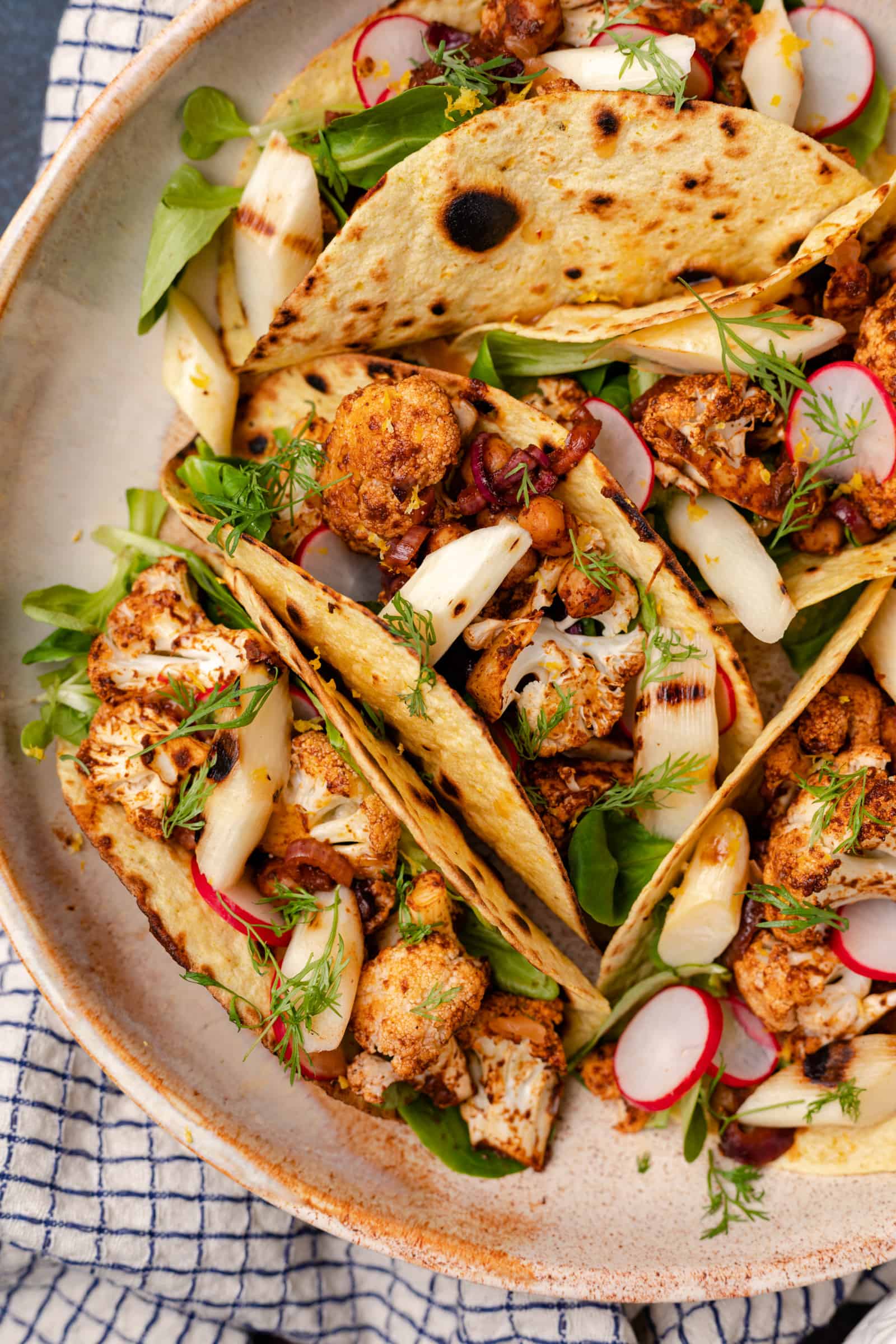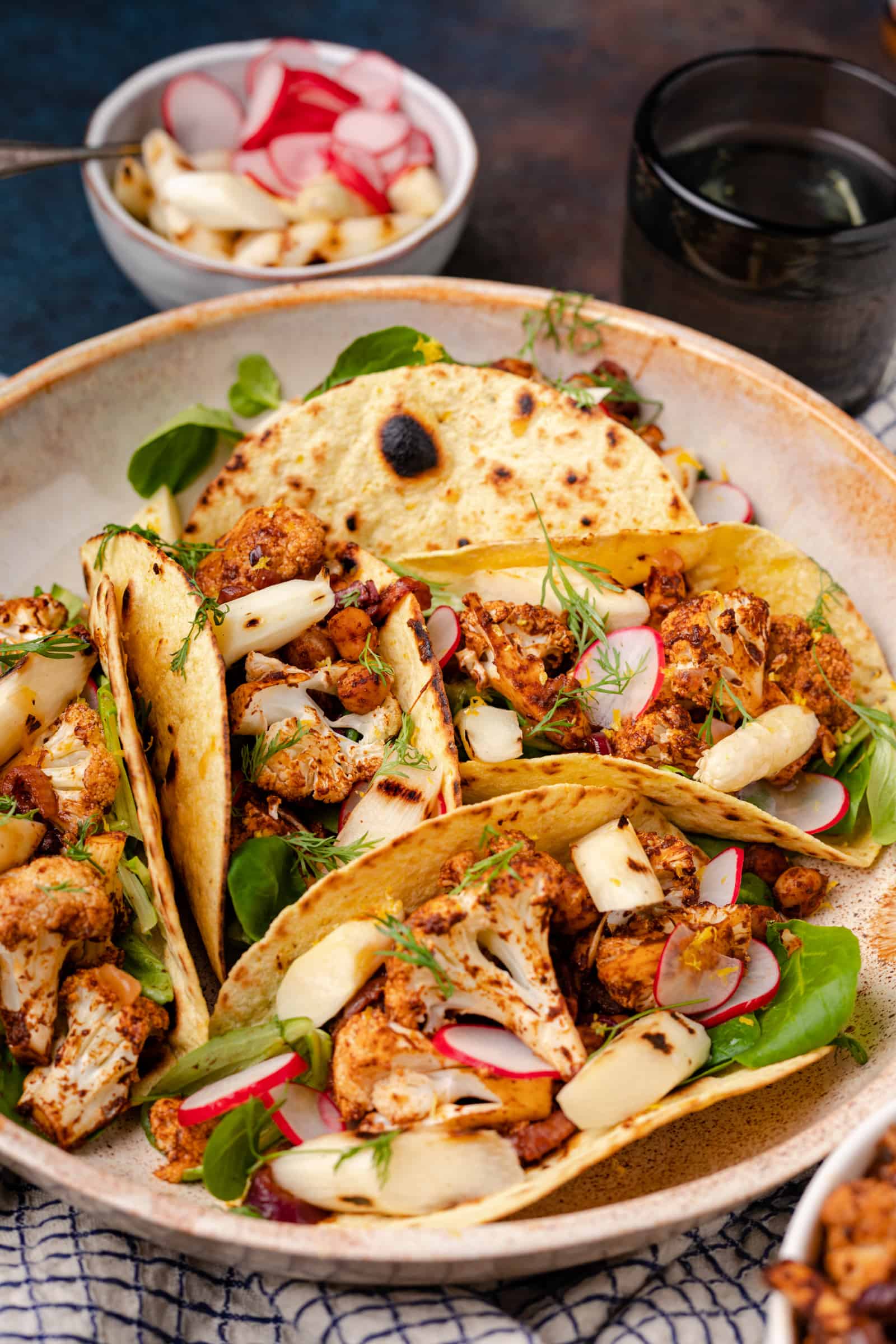 Geniet van deze heerlijke lente taco’s met bloemkool, asperges en kikkererwten!
