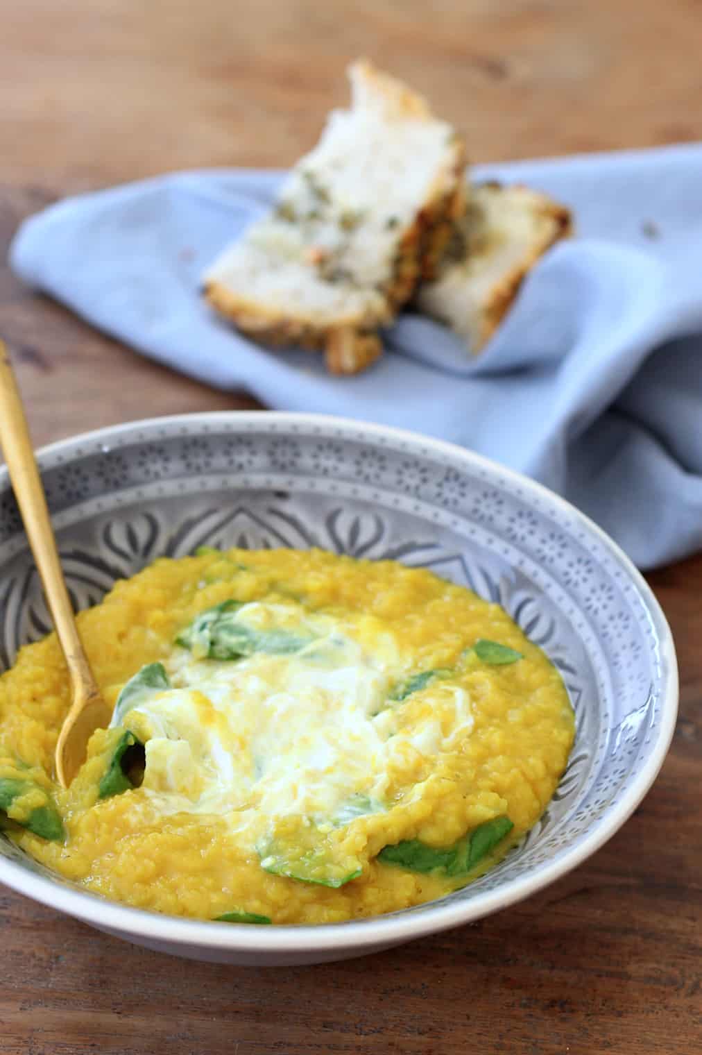 - Roer de spinazie vlak voor het serveren door de hete soep. Serveer de soep in kommen met een lepel tahinyoghurt.