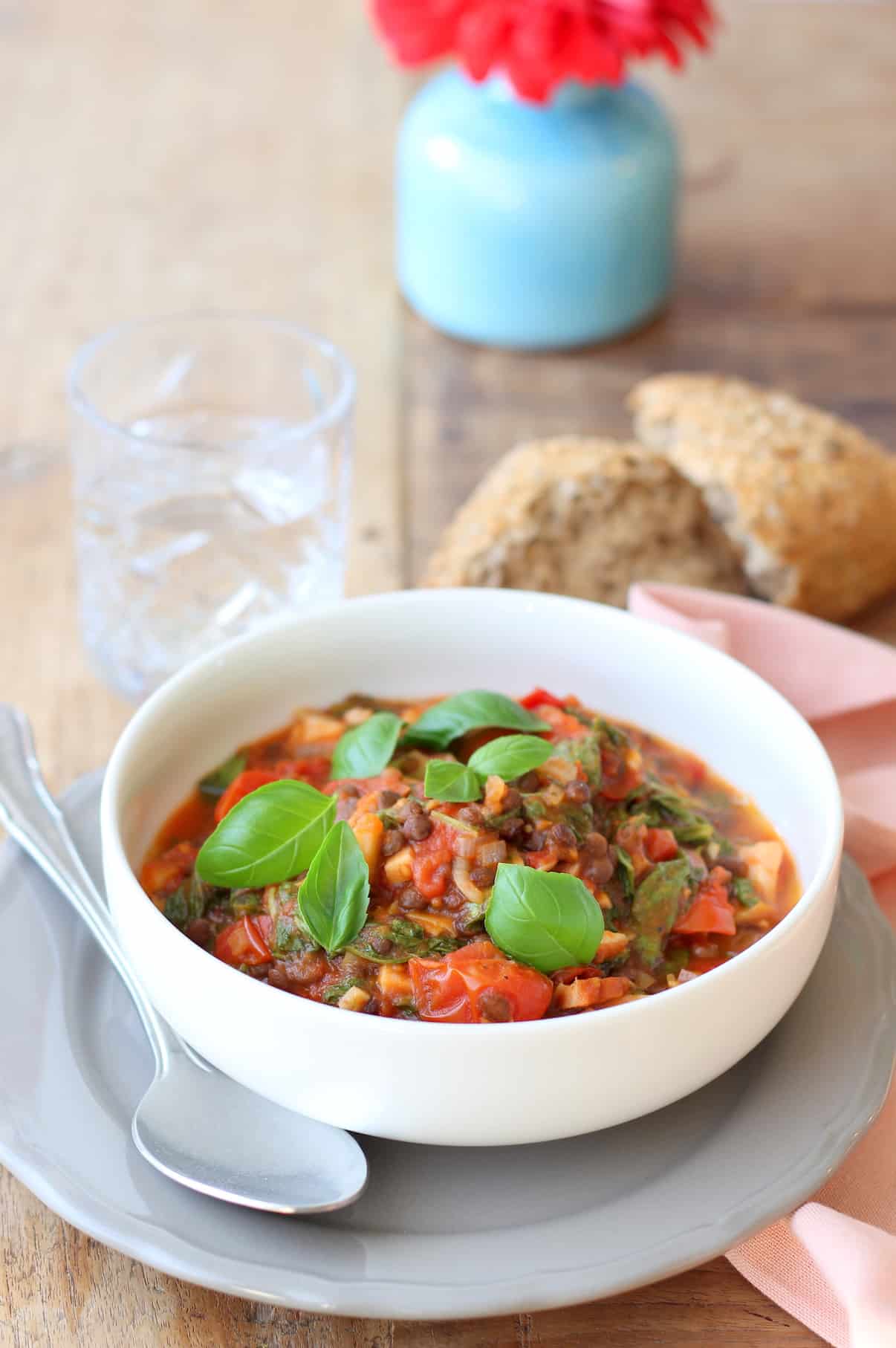7. Serveer de linzenstoof met blaadjes verse basilicum en harde broodjes om in de saus te dopen.