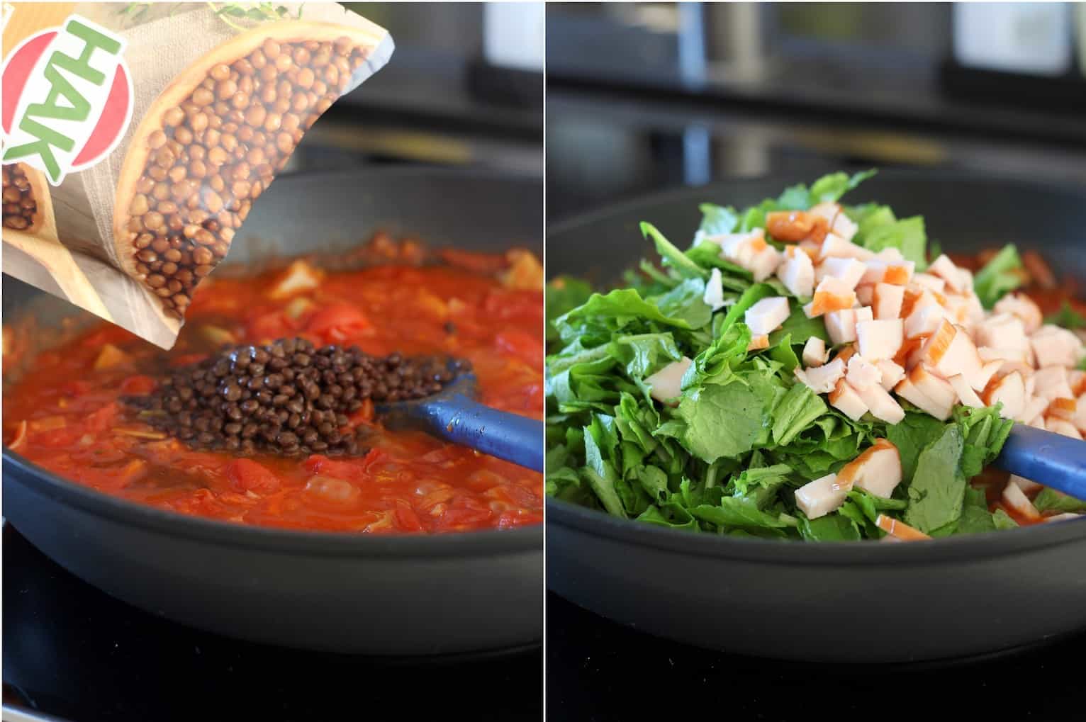 Nou is voedingswaarde belangrijk, maar smaak minstens net zo veel. Iets kan namelijk heel ‘gezond’ zijn, maar als het niet te eten is word ik er ook niet gelukkig van. Met deze linzenstoof met raapstelen, artisjokken en gerookte kip kun je aankomen thuis, zelfs mijn 6-jarige Jessey zat aan tafel en zei de magische woorden “Zo, mama, dit is echt lekker! En echt warm, dus ik moet even wat beter blazen.” Na het blazen was zijn bord heel snel leeg.