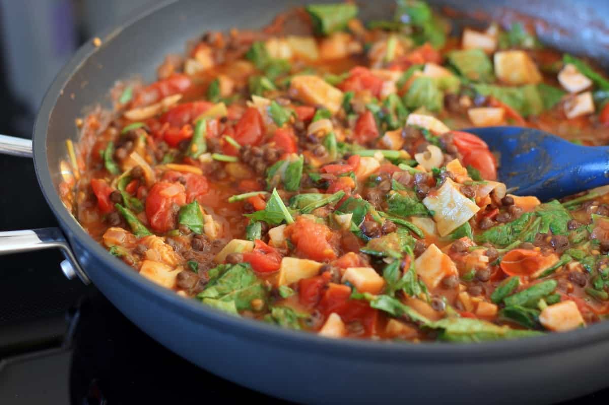 Ik heb altijd wel wat bonen in huis, zowel in stazak als blik. Onder andere rode en bruine bonenmix, kidneybonen, kikkererwten, zwarte bonen en linzen. En met de laatste heb ik een heerlijk recept gemaakt dat binnen 20 minuten klaar is en bomvol eiwitten, vezels, mineralen en vitaminen zit. Omdat ik zo veel sport de laatste tijd moet ik ook veel meer eiwitten eten en die probeer ik voor een deel ook uit plantaardige bronnen te halen. Linzen zijn daar perfect voor!