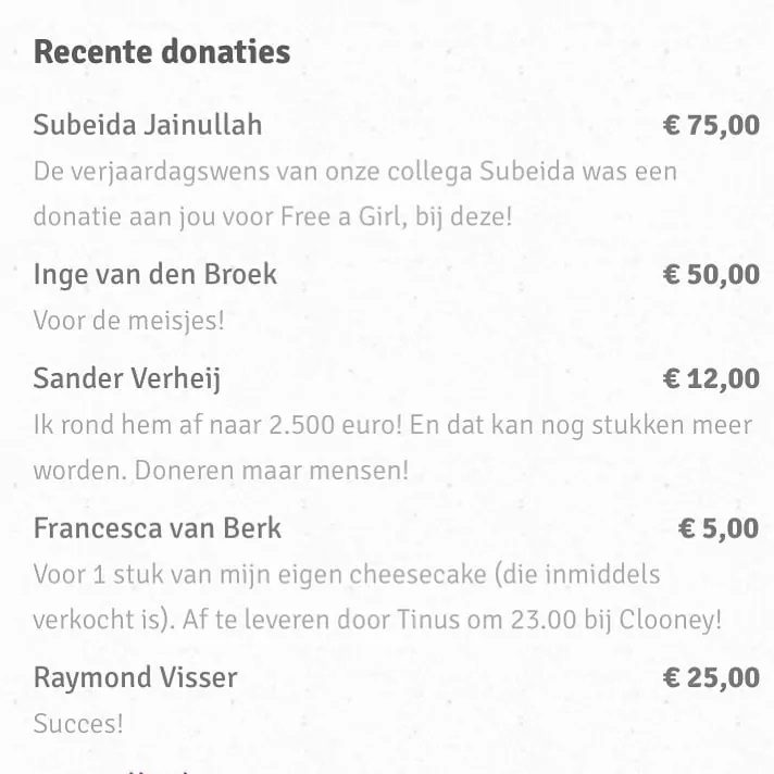 Het gaat ook geweldig met de donaties en er staan af en toe zulke lieve teksten bij dat ik er een brok van in mijn keel krijg. Jullie zijn geweldig en het is inderdaad ‘allemaal voor de meisjes’.