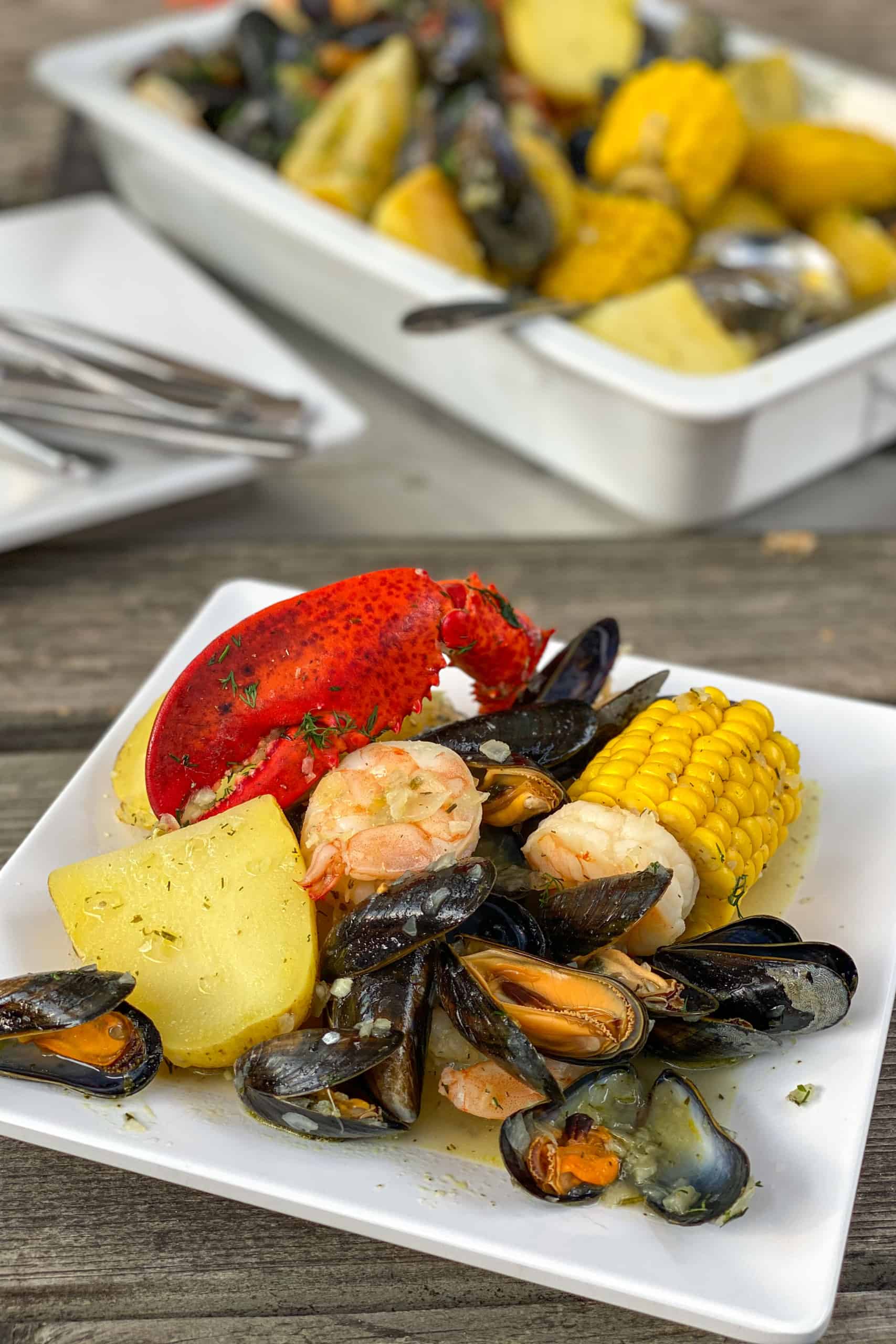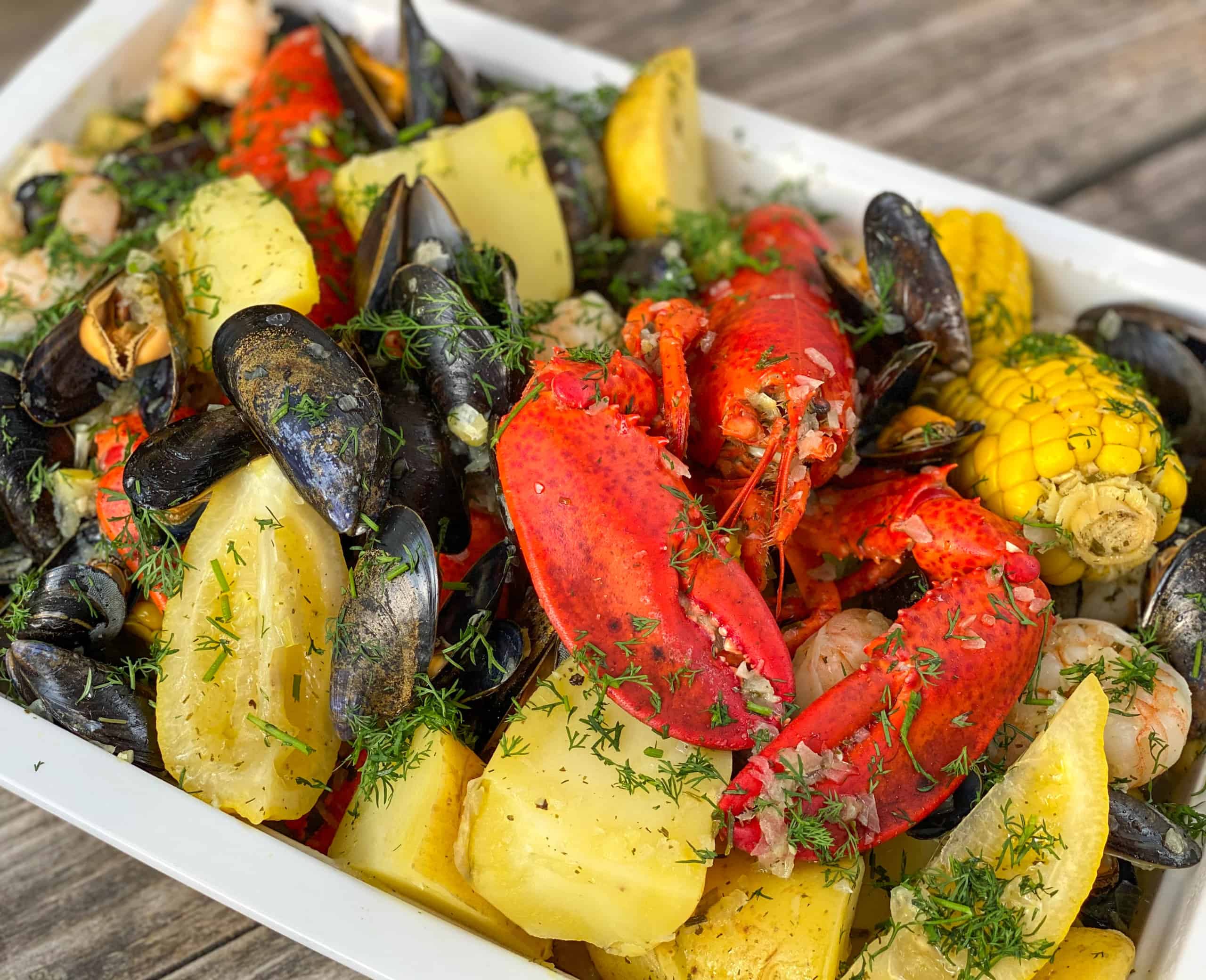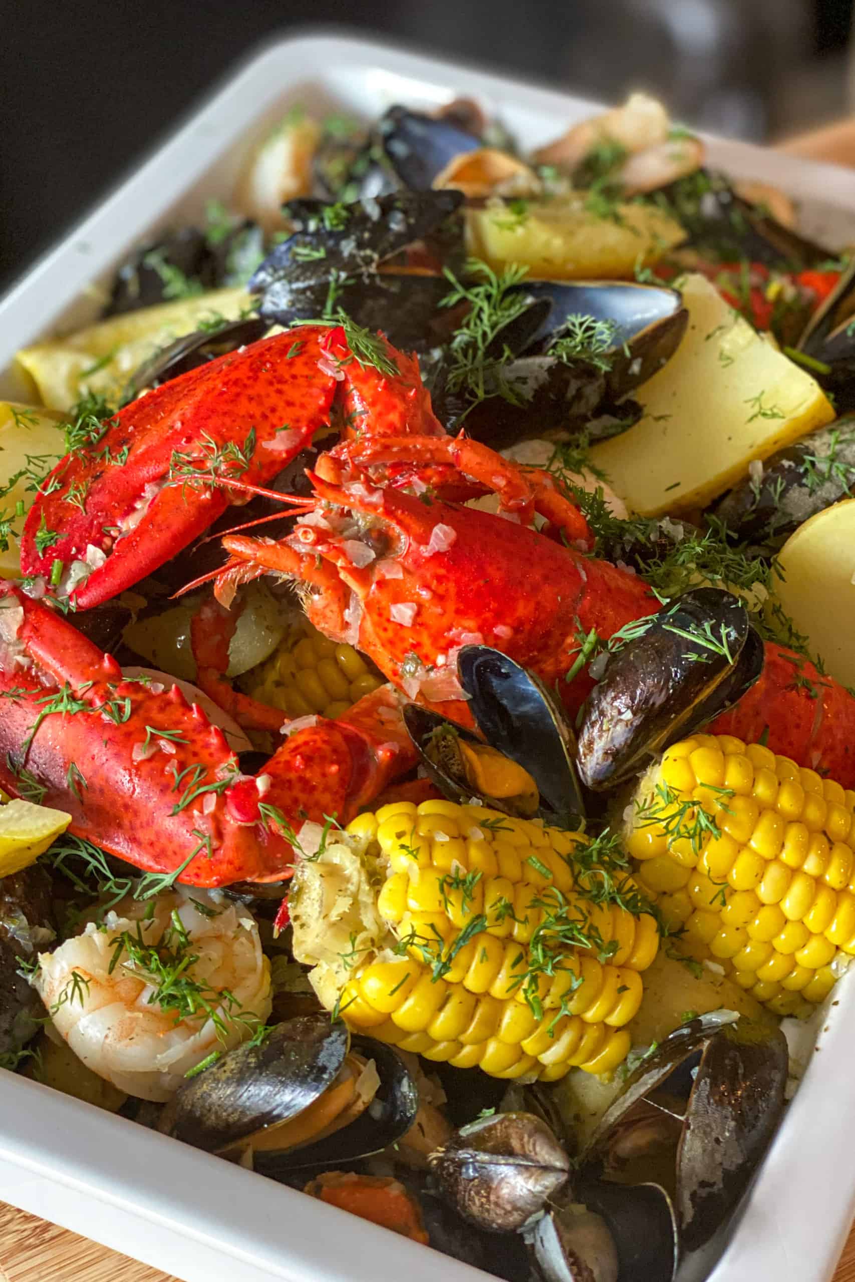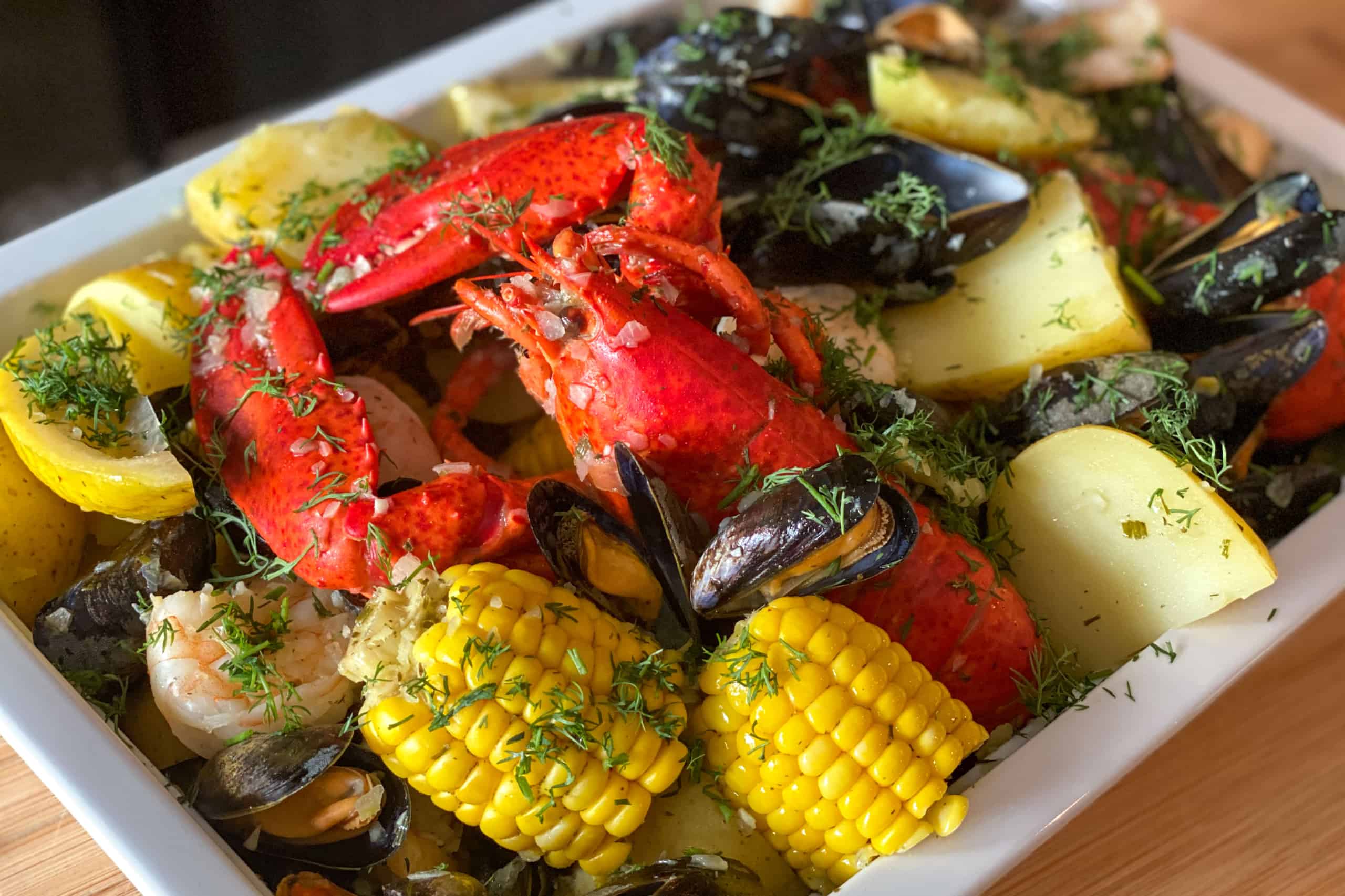Op een zondagavond keek ik samen met de Mr. naar een reality serie over een Amerikaanse horecafamilie die in hun drukste periode van het jaar zaten, vlak voor de 4th of July. Geen idee meer hoe ze heten of wat er verder gebeurde, want ik raakte volledig afgeleid vanaf het moment dat een van de zonen een lobster boil maakte in zijn restaurant. Ik had allang gegeten, maar zat alsnog watertandend naar de televisie te kijken. Nog geen half uur later had ik online Canadese kreeft (helaas was het Oosterscheldekreeftseizoen net voorbij) en Zeeuwse mosselen besteld en was ik er klaar voor om die week voor het eerst in mijn leven een lobster boil te maken.