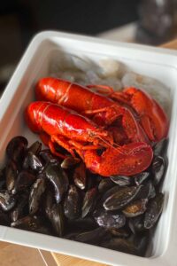 Voor een lobster boil maak je een krachtige, geurige bouillon waarin je je kreeft en andere schaal- en schelpdieren (ik koos voor grote garnalen en mosselen) kookt. De mosselen stoom je trouwens, maar daar kom ik hieronder in het recept nog verder op terug. Verder kun je ervoor kiezen om grote stukken vastkokende aardappel en maiskolven toe te voegen. Vergeet ook zeker niet om citroenen, verse kruiden en boter (liefst geklaarde) in huis te halen, want die horen zeker bij je lobster boil. Worst is trouwens ook nog een optie, denk aan lekkere venkelworstjes met knoflook bijvoorbeeld. Die bak je eerst aan zodat ze smaak afgeven aan je bouillon en later voeg je de worst toe in plakjes. Ik heb dat deze keer niet gedaan, maar ik ga ze zeker nog gebruiken als ik de stoere uitvoering van de lobster boil maak met cajun specerijen.