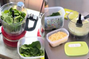 - 1.Meng de eieren, scheut melk, bladspinazie, snuf zout en peper in de keukenmachine of blender. Zet deze aan en blend goed tot de spinazie helemaal fijn is en het mengsel schuimig is.