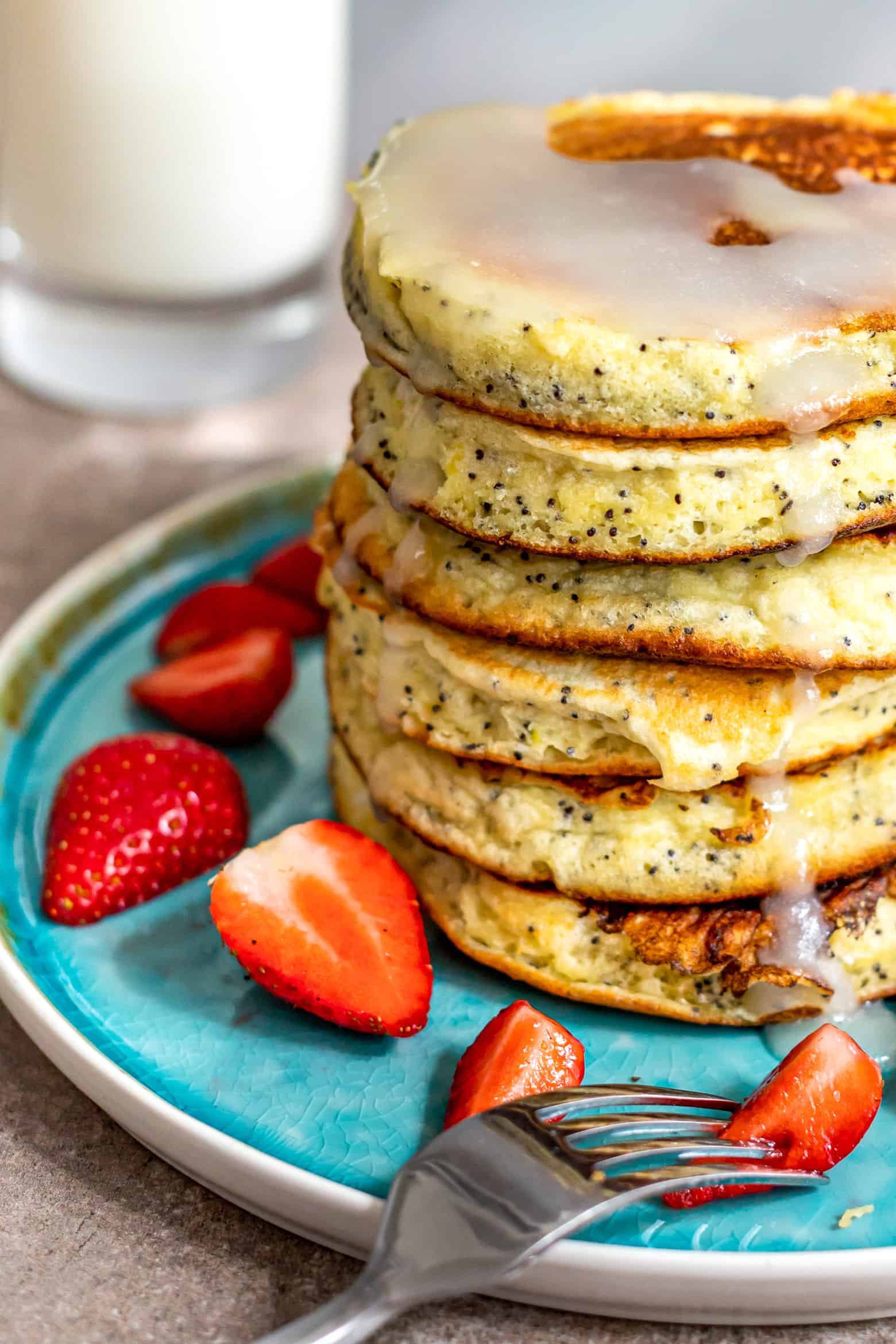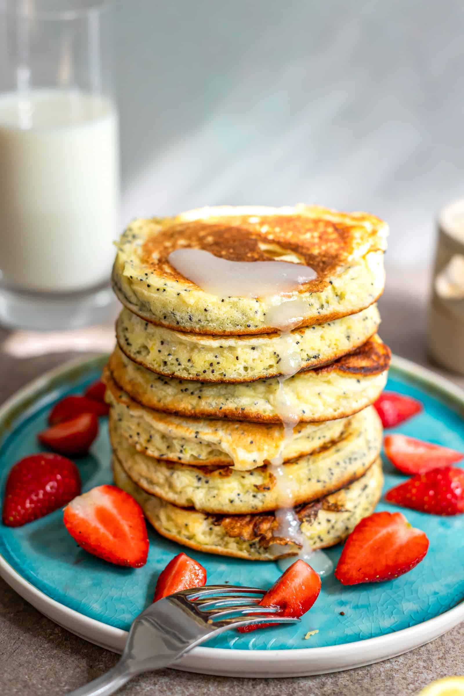 Deze heerlijk luchtige pancakes zijn geïnspireerd op de klassieke citroencake met maanzaad. En geloof me, in pancakevorm is het net zo’n succes! Ze zijn fluffy en door de citroenfrosting friszoet, een ideaal zomers ontbijt dus. Serveer ze met verse aardbeien (of ander vers fruit) en je dag kan niet meer stuk.
