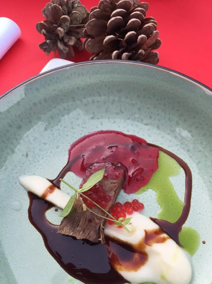 Eerst maar eens een kopje cranberrythee waarna het warme gerecht werd uitgeserveerd, vergezeld door een glas wijn. Op ons bordje lag een heerlijk stukje sukade met pastinaakpuree, cranberrysaus, oma’s jus, cranberrykaviaar, spinazieolie en wat groen uit het bos.