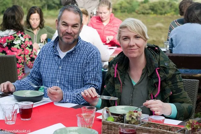 Na zo’n 10 minuten flink tegen de wind in fietsen – wat was ik blij met mijn elektrische fiets, bedankt daarvoor Zeelen fietsverhuur – kwamen we aan bij een wandelpad waar we de fietsen konden stallen. Al wandelend door de bossen kwamen we aan bij een groot veld waar de cranberry’s groeien. Aan de rand van het veld was een soort pop-up restaurant klaargezet. Lange tafels stonden te wachten om gevuld te worden met de lekkerste gerechtjes van de chef van Badhotel Bruin.