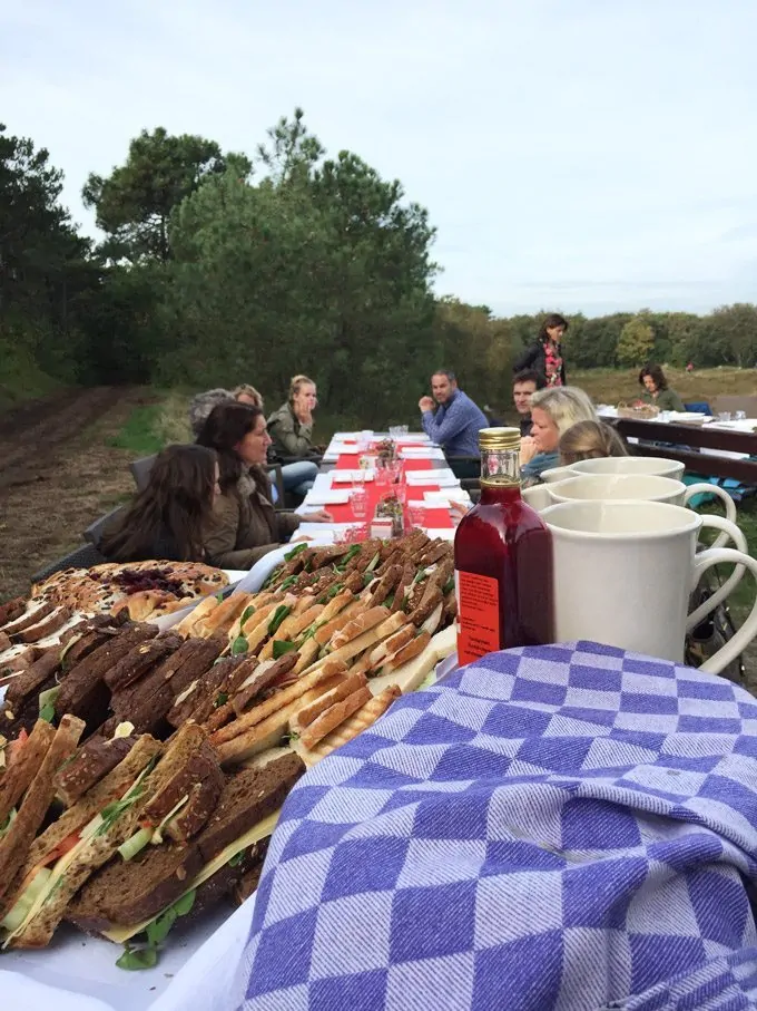 Na deze fantastische opening konden we sandwiches en suikerbrood pakken. Waarbij we ook de zelfgemaakte cranberrycompote -en gelei proefden die zelf gemaakt wordt door 2, geboren en getogen, Vlielandse dames. We vonden het beide erg bijzonder om zo in de open lucht – in oktober – te lunchen!