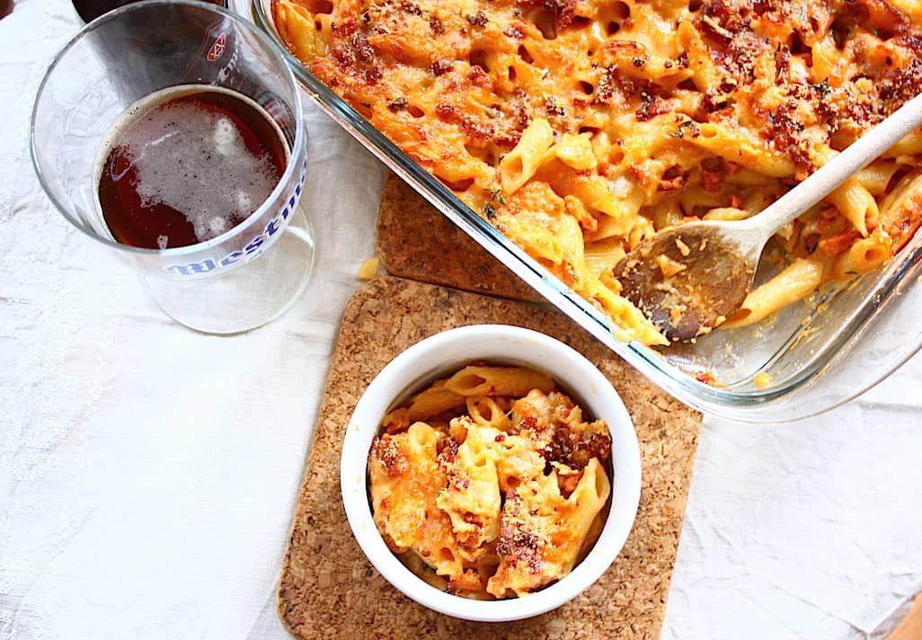 Dit is weer eens een hele andere versie van mac & cheese! Namelijk een variant waar donker bier aan is toegevoegd samen met cheddar en vegetarische gerookte spekjes. Je kunt natuurlijk ook echt spekjes gebruiken als het niet vegetarisch hoeft, maar in een gerecht als deze doen de vegetarische spekjes heel goed hun werk.