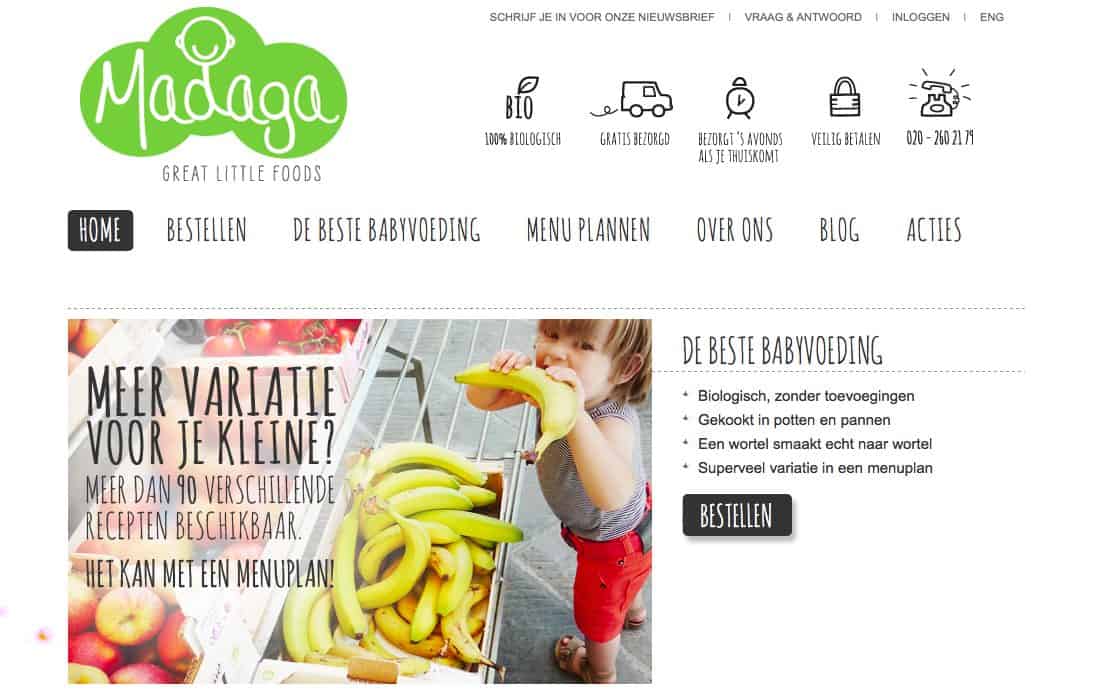 Madaga kookt vers en 100% biologisch voor baby’s en peuters. Wortel smaakt naar wortel en er worden geen E-nummers, kleur- en smaakstoffen, conserveermiddelen en zout toegevoegd. Gerechten worden niet ingevroren of gesteriliseerd, vers is gewoon echt vers. Ze hebben een vast basisassortiment (wat trouwens ook bij Marqt verkrijgbaar is) en een weekmenu wat je zelf helemaal kunt samenstellen uit meer dan 90 recepten. Alle recepten zijn ontwikkeld samen met een diëtiste en hebben een goede balans tussen vis, vlees, gevogelte en tofu en er wordt veel vers fruit, groenten en granen gebruikt.