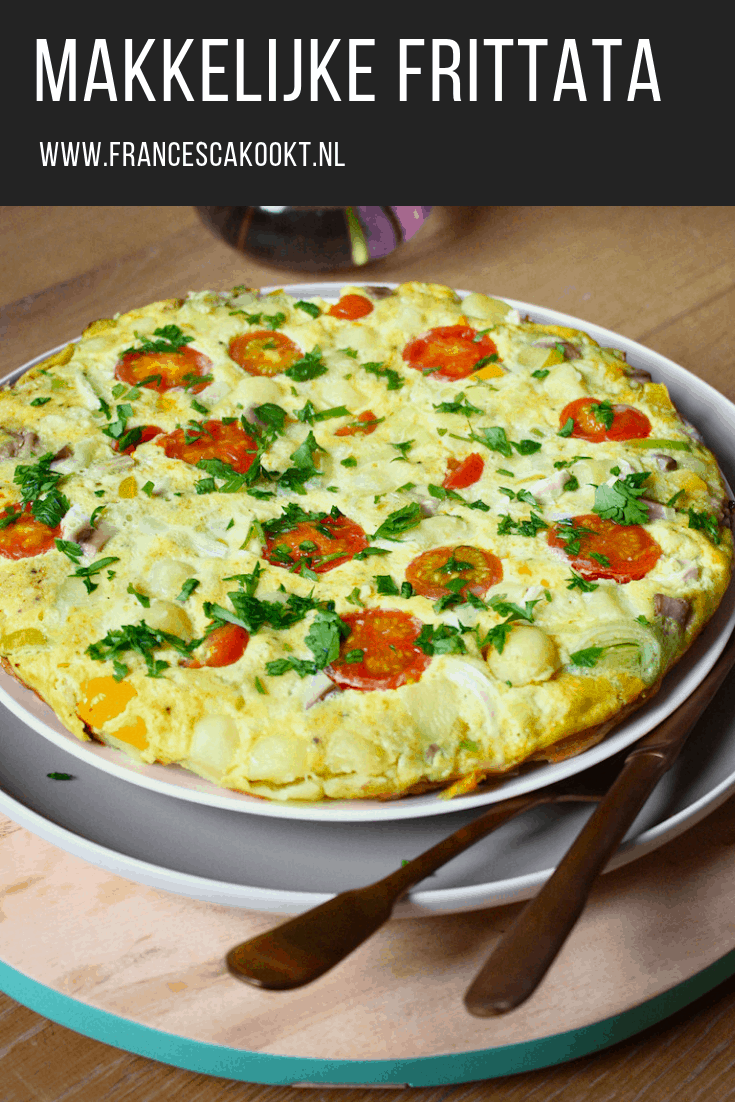 Tip: Je kunt de frittata ook garen in de oven. Bak dan eerst alles aan in de pan en zet de pan (mits ovenbestendig) 15 – 20 minuten in een voorverwarmde oven op 200 graden. Je kunt ook alles overscheppen in een ovenschaal. Met een beetje aluminiumfolie erover gaat het garen nog sneller.
