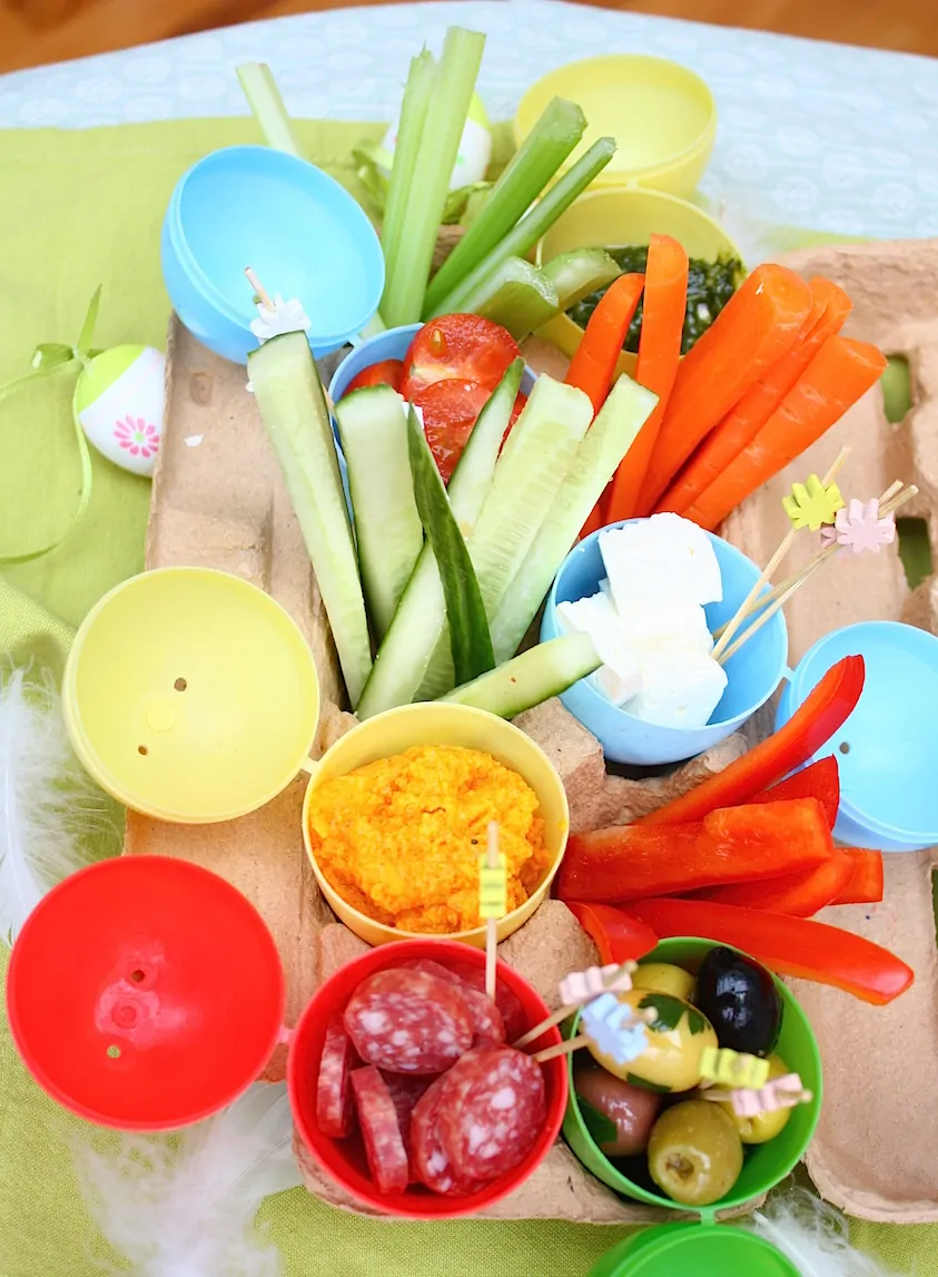 De paassnacks die ik heb gemaakt bestaan uit groenten en allerlei hartige hapjes. Dat leek mij wel lekker zo tussen alle zoete broodjes en taartjes in. Uiteraard kun je met dit recept zoveel variëren als je zelf wilt. In plaats van groenten kun je ook voor fruit gaan met zoete smeersels erbij. Wat betreft de smeersels, die kun je zelf maken zoals ik deed met de basilicum munt pesto en pompoen hummus, maar je kunt ook voor andere smeersels gaan zoals baba ganoush en muhamarra. Wil je het jezelf graag nog makkelijker maken dan kun je de smeersels natuurlijk ook aanschaffen in de winkel. Persoonlijk houd ik wel van de meest verse varianten, dus als ik ervoor kies om smeersels te kopen haal ik deze het liefst vers bij bijvoorbeeld de kaasboer. Â