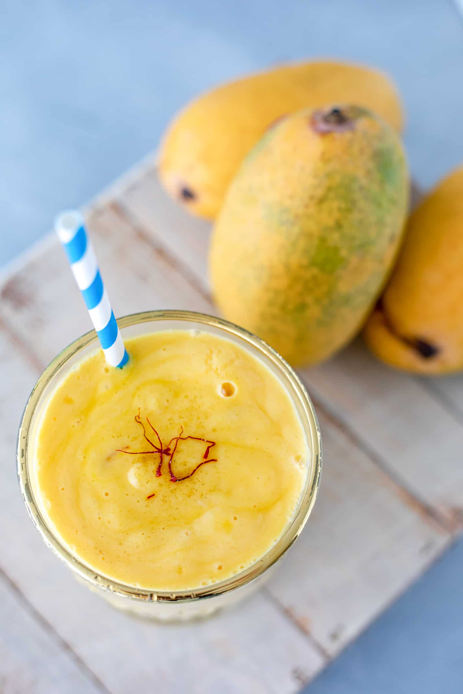 Goed, dat gezegd hebbende gaan we nu even door naar de specerijen die je ook nog kunt gebruiken. Denk aan kardemom of saffraan die ik beide heb gebruikt in mijn recept, maar het is geen must. Soms wordt de mango lassi ook nog afgetopt met nootjes zoals pistache. Heb ik niet gedaan, kun jij natuurlijk wel doen. Verder kun je de mango lassi zo drinken of je serveert ‘m in een glas met ijsblokjes. En als laatste kun je ervoor kiezen om nog wat honing toe te voegen. Is volledig naar wens, maar als je mango rijp en zoet genoeg is vind ik dat persoonlijk weer niet nodig.