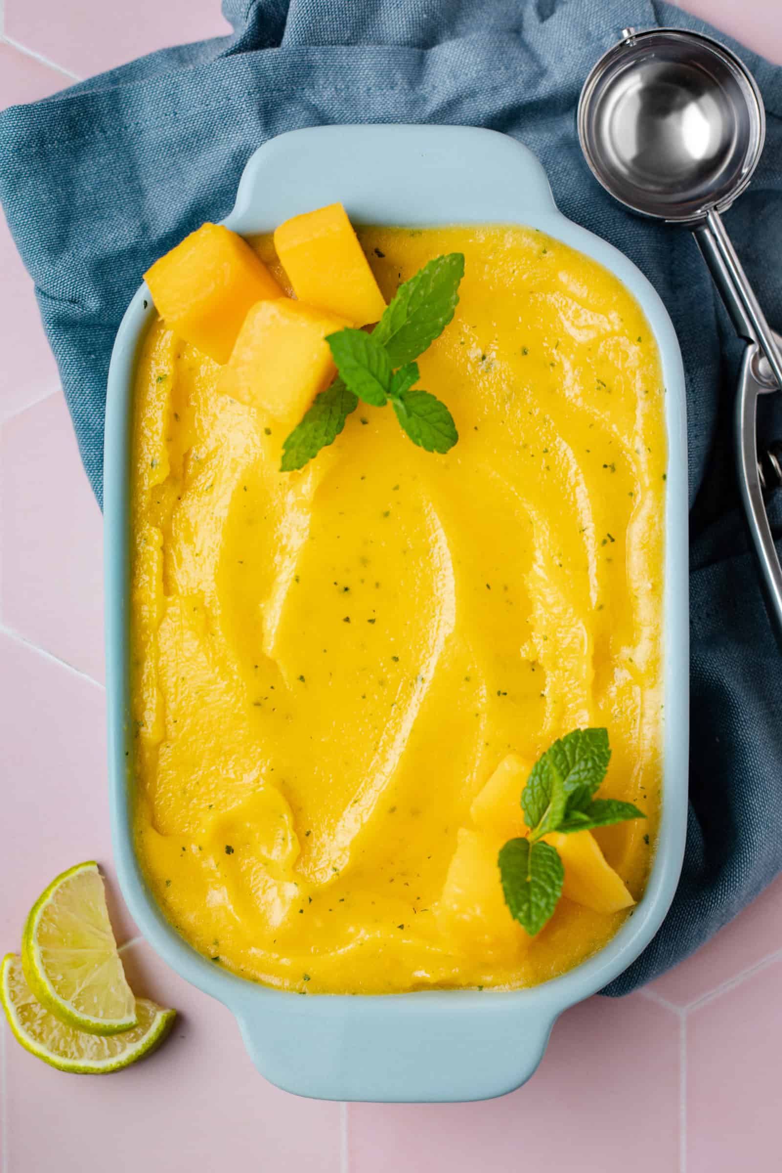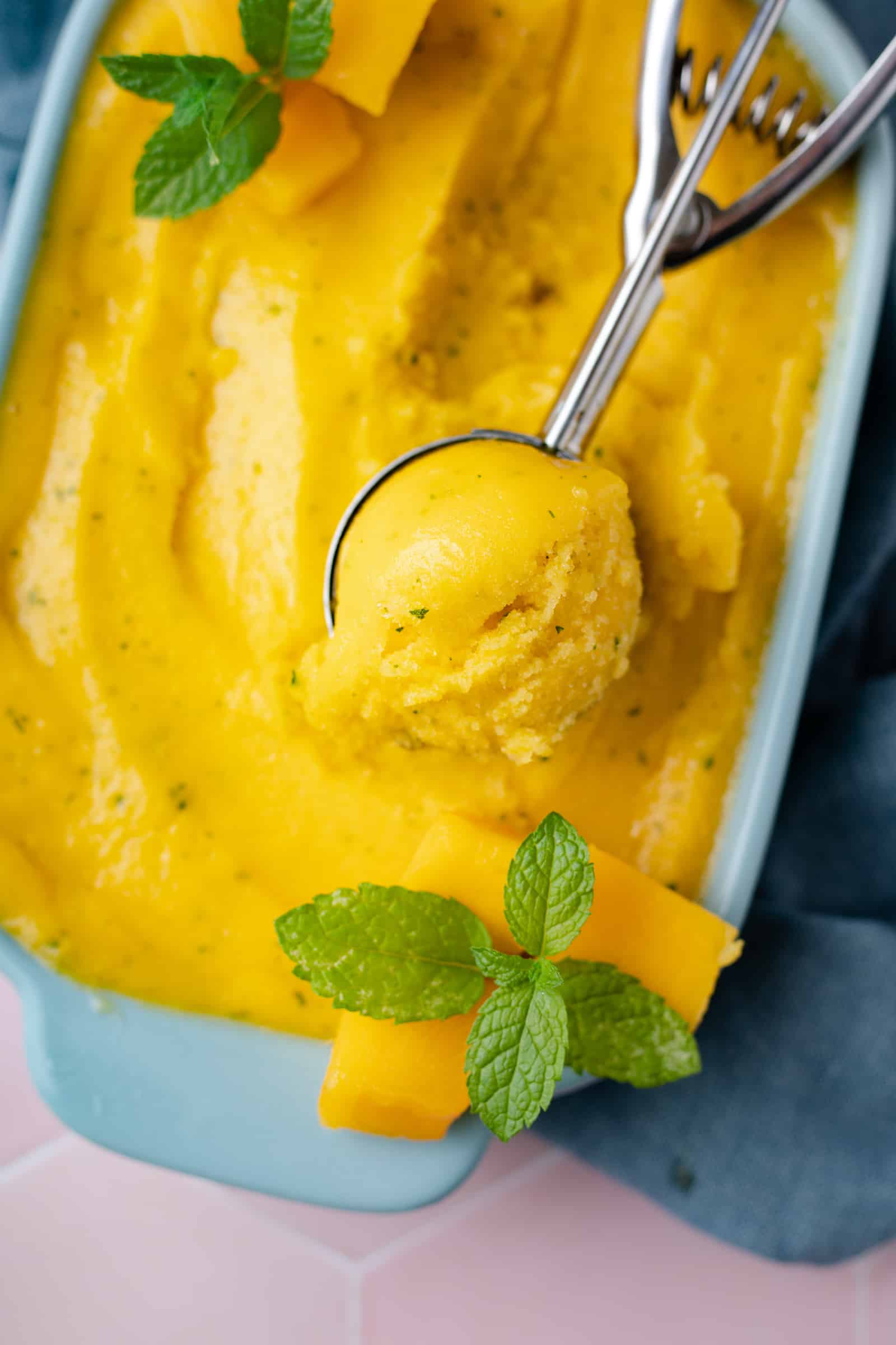 Mango en munt zijn een ongeëvenaarde match in de zomer. Ik besloot ze daarom samen te voegen in dit mango sorbetijs met munt en voegde daar ook nog wat limoen aan toe. En dat was me toch lekker! Zoete mango met friskruidige tonen van de munt en nog een licht zuurtje van de limoen. Zo wil ik iedere dag wel ijs eten.