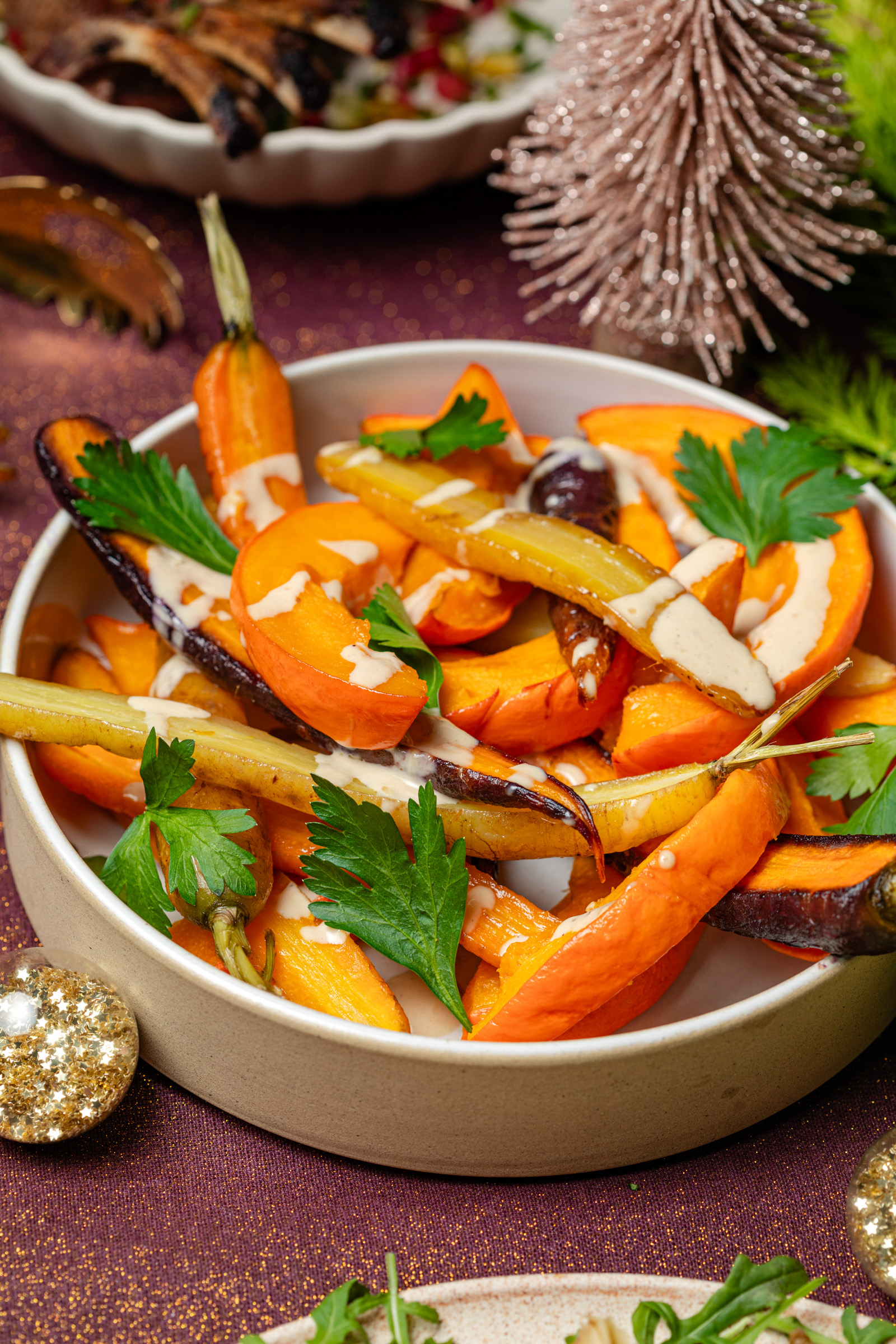 Voor bij de lamsrack maakte ik deze geroosterde groenten uit de oven met een super simpele tahin-sinaasappelsaus die waanzinnig is van smaak en goed combineert met aardse groenten uit dit seizoen. Ik koos voor pompoen en gekleurde wortels, maar je kunt ook kiezen voor knolselderij of pastinaak.
